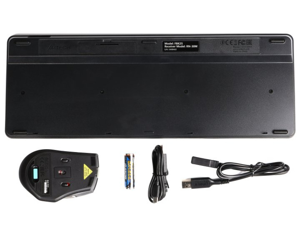 - В комплекте: клавиатура, мышь, нано-ресивер, 1 щелочная батарея AA, удлинительный USB-кабель, зарядный кабель Type-C, руководство пользователя