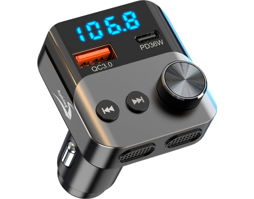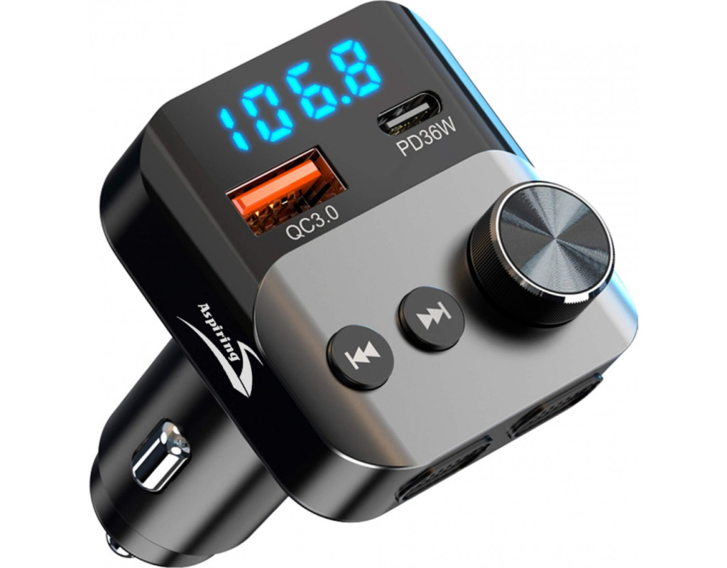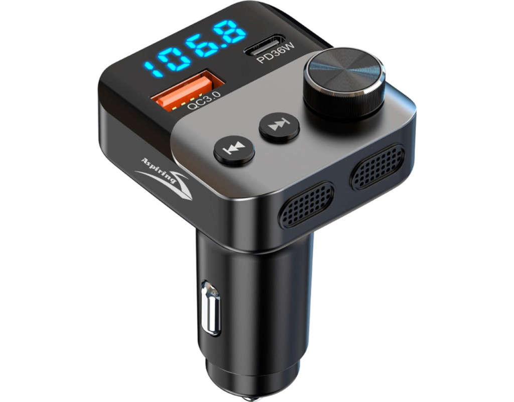 Современный FM-трансмиттер Aspiring Wave 13 (54W) – это устройство, с которым вы сможете существенно расширить функциональные возможности вашего автомобиля. Он транслирует аудиофайлы на 206 FM-каналах, имеет радиус действия до 10 метров, поддерживает USB-носители и оснащен Bluetooth. Aspiring Wave 13 выполнен в классическом стиле и оснащен портами для быстрой зарядки: