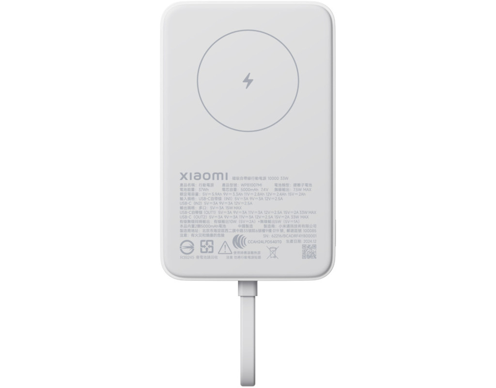 Удобный павербанк всегда под рукой Внешний аккумулятор Xiaomi обеспечивает быструю проводную зарядку мощностью до 33 Вт и мгновенную беспроводную подзарядку, стоит только подключить его к смартфону. Встроенный мощный магнит гарантирует прочность соединения и стабильность процесса восполнения емкости. Модель оснащена батареей с одновременно парой ячеек, что обеспечивает емкость 10 000 мА·ч для более длительной автономной работы подключенных девайсов. Беспроводной комфорт Эффективное и стабильное магнитное притяжение обеспечивает мгновенный коннект корпуса гаджета и павербанка. Зарядка стартует сразу после подключения, чтобы ты мог наслаждаться высокой продуктивностью без кабелей или ручного вмешательства. Закрывает все потребности в заряде Проводная быстрая зарядка мощностью до 33 Вт предлагается в каждом из портов USB-C павербанка Xiaomi. Девайс оперативно заряжает iPhone 16 Pro примерно до 58% всего лишь за 30 минут. Для обеспечения безопасности аккумулятора в гаджете первые 85% заряда восполняются на максимум, а последующие 15% в режиме микротока. Подзаряжайся на ходу Портативная батарея обеспечивает максимальную выходную мощность 7,5 Вт для быстрой магнитной зарядки. Совместима с iPhone 12 и более поздними сериями. Забудь о дополнительных проводах: смартфон легко фиксируется на павербанке, который весит всего лишь 238 г, без кабелей, которые не спутываются в руках во время зарядки на ходу. Зарядка без потери времени Модель разработана для одновременной подзарядки трех устройств без саморазрядки при использовании проводного или беспроводного способа подключения. Уровень мощности в любом из случаев остается достаточным для быстрого и эффективного восполнения уровня заряда. Всегда готов к работе Павербанк Xiaomi заряжается от двух портов USB-C одновременно и имеет максимальную мощность 30 Вт. Для полной зарядки устройства необходимо 2 часа 20 минут. Заряда хватит на всех; Аккумулятор большой емкости на 10 000 мА·ч оснащен двумя высокопроизводительными ячейками емкостью по 5000 мА·ч. Девайс имеет достаточно мощности, чтобы зарядить iPhone 16 Pro примерно дважды. Увеличенный срок службы аккумулятора для вашего спокойствия. Простое магнитное крепление предотвращает перебои с электропитанием, гарантируя стабильный процесс. Стильный и удобный Девайс имеет продуманный форм-фактор и небольшие размеры. Одинаково удобен для проводной и беспроводной зарядки. Удобное кабельное подключение дает возможность расположить павербанк в любой части рабочего стола. Беспроводная технология открывает комфорт восполнения уровня заряда на ходу, в поездках, на совещаниях. Матовый корпус с силиконовой магнитной панелью гарантирует приятное на ощупь покрытие, уменьшающее риск появления царапин на корпусе телефона. Поместится где угодно Модель тонкая и компактная: легко помещается в кармане сумки или рюкзака, становясь важным компаньоном для решения разных задач. Портативный павербанк удобно брать с собой в путешествия. Благодаря закругленным краям его комфортно держать в руке, даже когда он подключен к смартфону. Постоянный контроль Яркий индикатор обеспечивает быстрый и удобный мониторинг уровня заряда павербанка. Четыре световых индикатора наглядно показывают весь оставшийся уровень емкости батареи. Будь в курсе процессов для своевременной зарядки и про