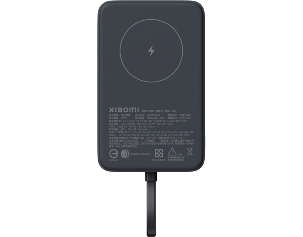 Удобный павербанк всегда под рукой Внешний аккумулятор Xiaomi обеспечивает быструю проводную зарядку мощностью до 33 Вт и мгновенную беспроводную подзарядку, стоит только подключить его к смартфону. Встроенный мощный магнит гарантирует прочность соединения и стабильность процесса восполнения емкости. Модель оснащена батареей с одновременно парой ячеек, что обеспечивает емкость 10 000 мА·ч для более длительной автономной работы подключенных девайсов. Беспроводной комфорт Эффективное и стабильное магнитное притяжение обеспечивает мгновенный коннект корпуса гаджета и павербанка. Зарядка стартует сразу после подключения, чтобы ты мог наслаждаться высокой продуктивностью без кабелей или ручного вмешательства. Закрывает все потребности в заряде Проводная быстрая зарядка мощностью до 33 Вт предлагается в каждом из портов USB-C павербанка Xiaomi. Девайс оперативно заряжает iPhone 16 Pro примерно до 58% всего лишь за 30 минут. Для обеспечения безопасности аккумулятора в гаджете первые 85% заряда восполняются на максимум, а последующие 15% в режиме микротока. Подзаряжайся на ходу Портативная батарея обеспечивает максимальную выходную мощность 7,5 Вт для быстрой магнитной зарядки. Совместима с iPhone 12 и более поздними сериями. Забудь о дополнительных проводах: смартфон легко фиксируется на павербанке, который весит всего лишь 238 г, без кабелей, которые не спутываются в руках во время зарядки на ходу. Зарядка без потери времени Модель разработана для одновременной подзарядки трех устройств без саморазрядки при использовании проводного или беспроводного способа подключения. Уровень мощности в любом из случаев остается достаточным для быстрого и эффективного восполнения уровня заряда. Всегда готов к работе Павербанк Xiaomi заряжается от двух портов USB-C одновременно и имеет максимальную мощность 30 Вт. Для полной зарядки устройства необходимо 2 часа 20 минут. Заряда хватит на всех; Аккумулятор большой емкости на 10 000 мА·ч оснащен двумя высокопроизводительными ячейками емкостью по 5000 мА·ч. Девайс имеет достаточно мощности, чтобы зарядить iPhone 16 Pro примерно дважды. Увеличенный срок службы аккумулятора для вашего спокойствия. Простое магнитное крепление предотвращает перебои с электропитанием, гарантируя стабильный процесс. Стильный и удобный Девайс имеет продуманный форм-фактор и небольшие размеры. Одинаково удобен для проводной и беспроводной зарядки. Удобное кабельное подключение дает возможность расположить павербанк в любой части рабочего стола. Беспроводная технология открывает комфорт восполнения уровня заряда на ходу, в поездках, на совещаниях. Матовый корпус с силиконовой магнитной панелью гарантирует приятное на ощупь покрытие, уменьшающее риск появления царапин на корпусе телефона. Поместится где угодно Модель тонкая и компактная: легко помещается в кармане сумки или рюкзака, становясь важным компаньоном для решения разных задач. Портативный павербанк удобно брать с собой в путешествия. Благодаря закругленным краям его комфортно держать в руке, даже когда он подключен к смартфону. Постоянный контроль Яркий индикатор обеспечивает быстрый и удобный мониторинг уровня заряда павербанка. Четыре световых индикатора наглядно показывают весь оставшийся уровень емкости батареи. Будь в курсе процессов для своевременной зарядки и про