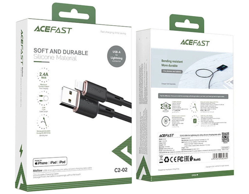 Дата кабель USB 2.0 AM to Lightning 1.2m 2.4A silicone C2-02 black Acefast (AFC2-02B)