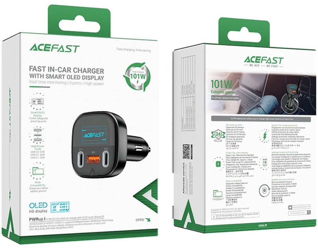 Acefast B5 – трехпортовое быстрое автомобильное зарядное устройство мощностью 101 Вт с OLED-дисплеем. На дисплее отображается информация о напряжении, токе и мощности каждого порта. Он дает пользователю возможность четко мониторить состояние зарядки в режиме реального времени. OLED-дисплей имеет привлекательный вид и высокую четкость. Все три порта Acefast B5 поддерживают несколько протоколов быстрой зарядки, что позволяет быстро восстановить запас энергии в большинстве устройств, таких как телефоны, планшеты, портативные компьютеры. Acefast B5 обеспечивает разумное распределение выходного напряжения, тока и мощности и предохраняет устройство от многократной зарядки. Быстрое автомобильное зарядное устройство Acefast B5 изготовлено из цинкового сплава. Он гарантирует наилучшее рассеяние тепла и быстрое охлаждение, обеспечивая безопасность подзарядки. |