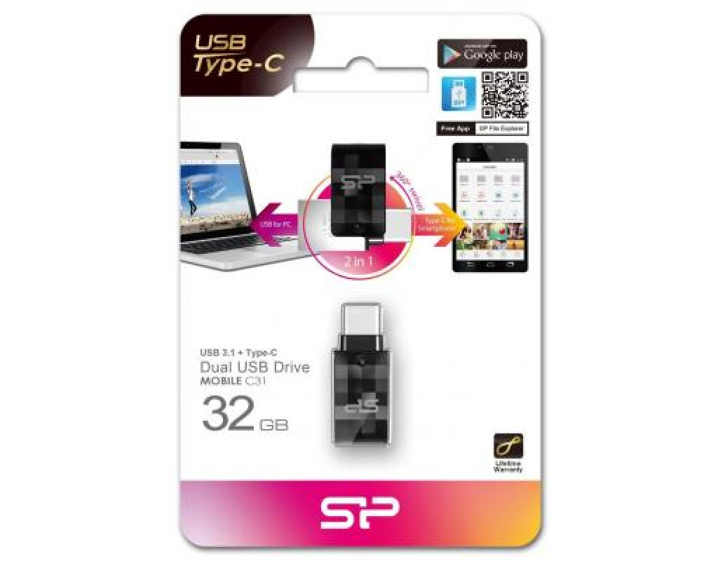 USB флеш накопитель Silicon Power 32GB Mobile C31 USB 3.1 / USB Type-C (SP032GBUC3C31V1K) Модельный ряд флэшек компании Silicon Power пополнился интересной новинкой – Silicon Power Mobile C31. Она изготовлена в компактном и легком металлическом корпусе с симпатичным дизайном и применением технологии COB, то есть внутренние компоненты защищены от воды, пыли, встрясок и вибраций. Главная же особенность USB флеш накопителя Silicon Power Mobile C31 USB 3.1 / USB Type-C заключается в наличии двух интерфейсов: USB 3.1 Gen1 Type-A и USB 3.1 Gen1 Type-C, которые совместимы со стандартами USB 3.0 и USB 2.0. В результате новинка может использоваться для обмена информацией, например, между смартфоном (поддерживаются ОС Android 4.1.x / Windows phone 8 или более поздние) и настольным или мобильным ПК (поддерживаются ОС Windows 10/8.1/8/7/Vista/XP, Mac OS 10.3.x, Linux 2.6.x или более поздние). В свою очередь особая конструкция закрепленного колпачка позволяет защищать один из интерфейсов. Покупателям Mobile C31 доступно специально разработанное бесплатное приложение для управления файлами SP File Explorer на смартфонах с системой Android. |