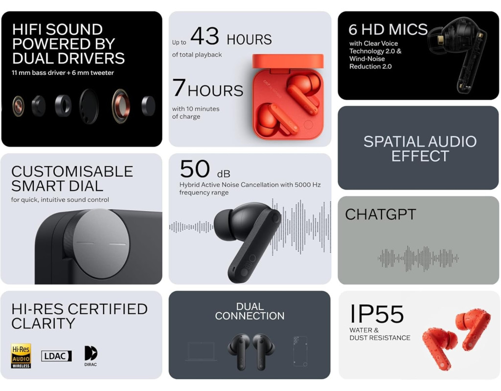 Это современные беспроводные наушники с активным шумоподавлением и уникальным фирменным колесом управления Smart Dial, которые предлагают отличное качество звука и инновационный дизайн. Эти наушники являются отличным выбором в среднем ценовом сегменте для тех, кто ценит стиль, функциональность и качество звучания. Драйверы: динамические 11 мм с покрытием титана для глубоких басов и 6 мм микропланарные твиттеры для высоких ярких частот. Дизайн и удобство использования Корпус кейса выполнен в минималистичном стиле в форме квадрата с закругленными краями, а сами наушники – компактные и легкие, весом всего около 4.9 г каждый. Особенностью модели является механическое колесо Smart Dial, расположенное на корпусе кейса, позволяющее удобно регулировать громкость, переключать режимы шумоподавления или активировать голосового ассистента. Наушники обеспечивают надежную посадку благодаря разнообразию сменных силиконовых насадок размеров S, M и L, а материалы корпуса и амбушюр отличаются долговечностью и приятными тактильными ощущениями. Качество звука и аудиофункции Благодаря двойным драйверам и поддержке Hi-Res аудио стандарта CMF by Nothing Buds Pro 2 передают кристально чистый звук с богатой гаммой: глубокий бас, четкие средние и яркие высокие частоты. Встроенная технология Dirac Opteo увеличивает детализацию и объем звука, создавая эффект присутствия. Поддержка адаптивного эквалайзера и индивидуальных настроек через приложение позволяет настроить звук по вкусу пользователя. Виртуальный объемный звук и Spatial Audio делают прослушивание максимально увлекательным, создавая эффект кинотеатра прямо у вас в ушах. Эффективность шумоподавления и режима прозрачности CMF Buds Pro 2 оснащены гибридной активной технологией шумоподавления, способной снизить окружающий шум до 50 дБ. Режим «адаптивного» ANC автоматически подстраивается под окружающую среду, обеспечивая максимальный комфорт при путешествиях, работе или прогулках. Режим прозрачности позволяет слышать окружающие звуки без снятия наушников – особенно важно для безопасности и комфортного общения. Интеллектуальные алгоритмы Wind Noise Reduction 2.0 минимизируют шум ветра при звонках, делая их понятными и разборчивыми. Автономность и особенности зарядки Одним из ключевых преимуществ CMF Buds Pro 2 является поразительная автономность. Наушники обеспечивают до 11 часов непрерывного прослушивания без активного шумоподавления, а с кейсом – до 43 часов. В режиме ANC время работы сокращается до 6.5 часов (наушники) и до 26 часов (с кейсом). Особое внимание уделено быстрой зарядке: всего 10 минут зарядки обеспечивают до 7 часов прослушивания без ANC и до 3 часов с включенной функцией шумоподавления. Зарядка производится через порт USB-C. Индикаторы заряда на наушниках и кейсе помогают следить за уровнем энергии, а наличие функции быстрой зарядки делает использование еще более комфортным. Buds Pro 2 – отличная модель для тех, кто ищет стильные и функциональные беспроводные наушники по разумной цене. |