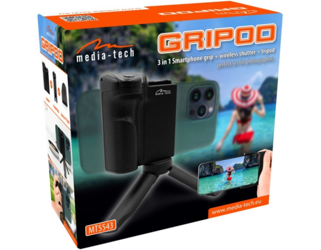 | Media-Tech Gripod MT5543 – компактное и многофункциональное устройство 3-в-1: держатель для смартфона, настольная подставка и Bluetooth-пульт. Делайте уникальные групповые фотографии, яркие автопортреты, проводите прямые эфиры, записывайте видеоблоги и таймлапсы.