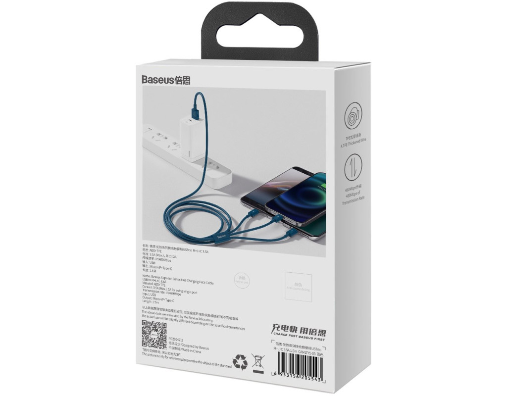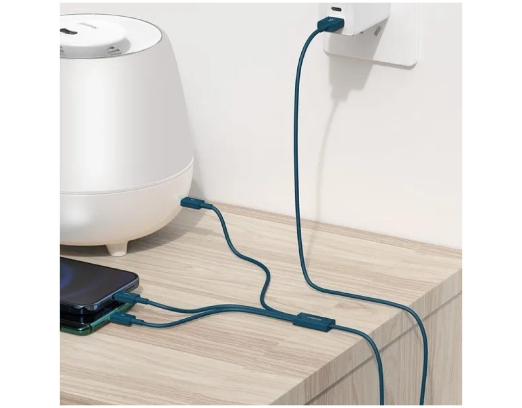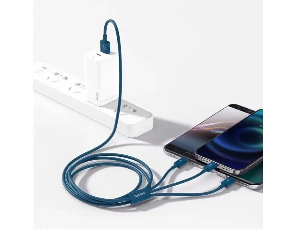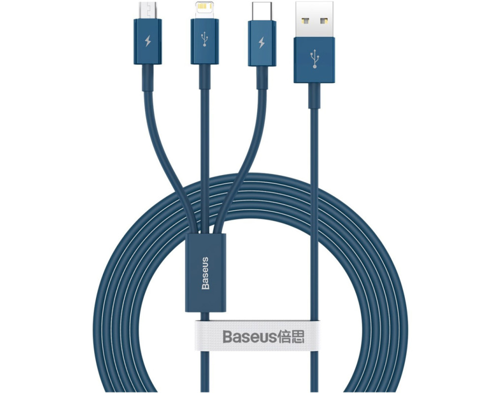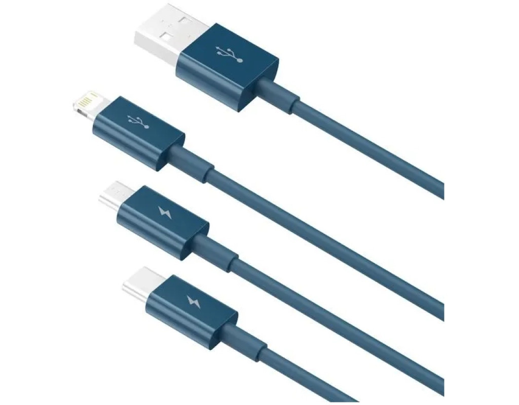 Кабель от производителя Baseus позволяет заряжать до 3-х устройств одновременно, а также производить обмен данными между гаджетами с разъемом Micro USB, USB-C и Lightning. Аксессуар достаточно компактен, выполнен в голубом цвете. Прочный металлический разъем и нейлоновое покрытие кабеля обеспечивают стабильную передачу сигнала и длительный срок использования. Длина изделия – 1.5 м, поэтому пользователь может свободно размещать устройства на своем рабочем месте. |