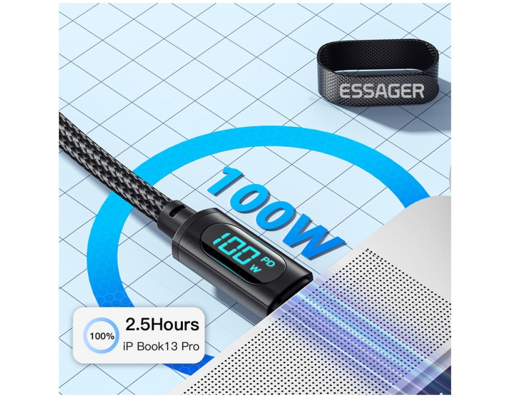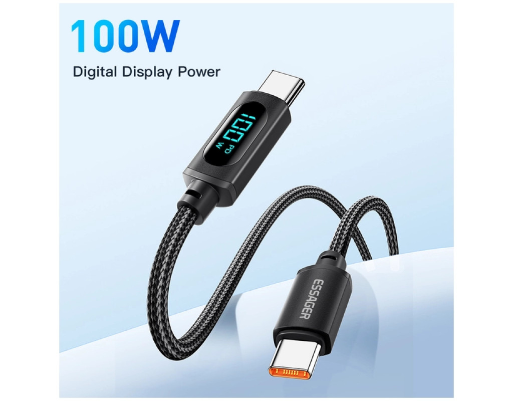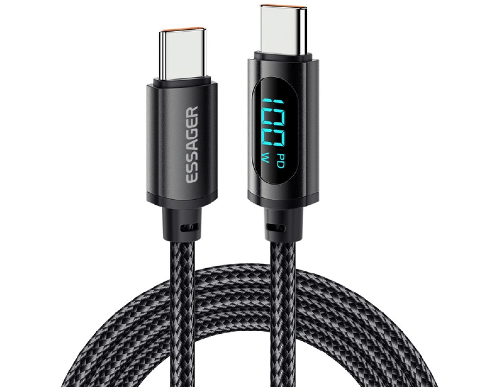 Зарядный кабель Essager имеет уникальную и качественную конструкцию, которая гарантирует длительное использование без потери функциональности. Форма разъемов и тканевая оплетка обезопасят от перегибания кабеля во время эксплуатации. Характеристики кабеля Essager Led Digital Display Type-C to Type-C 100W