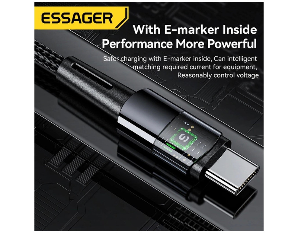 Кабель для быстрой зарядки Essager Type C to Type C 240W имеет встроенный чип E-Mark, который интеллектуально определяет протокол зарядки для мобильных телефонов, компьютеров, планшетов, геймпадов. И обеспечивает мощность 140 Вт/100 Вт/65 Вт/60 Вт/45 Вт/30 Вт в соответствии с самым высоким протоколом зарядки, поддерживаемым устройством. Чип E-Mark обеспечивает самую быструю и наиболее подходящую производительность для устройства и гарантирует безопасность устройства. Полностью заряжайте MacBook Pro за 1,5 часа — так же быстро, как и с оригинальным кабелем питания. Кабель для быстрой зарядки PD мощностью 240 Вт является идеальной заменой или запасным кабелем для ноутбуков/телефонов с разъемами USB-C/Thunderbolt 3. Безопасный заряд батареи Кабель Essager имеет встроенную защиту, которая устраняет перегрев и перегрузку. Заряжайте ваши устройства быстро и безопасно. Высококачественный кабель Essager Type C to Type-C 240W идеально совместим с любым устройством с разъемом USB-C. Характеристики: