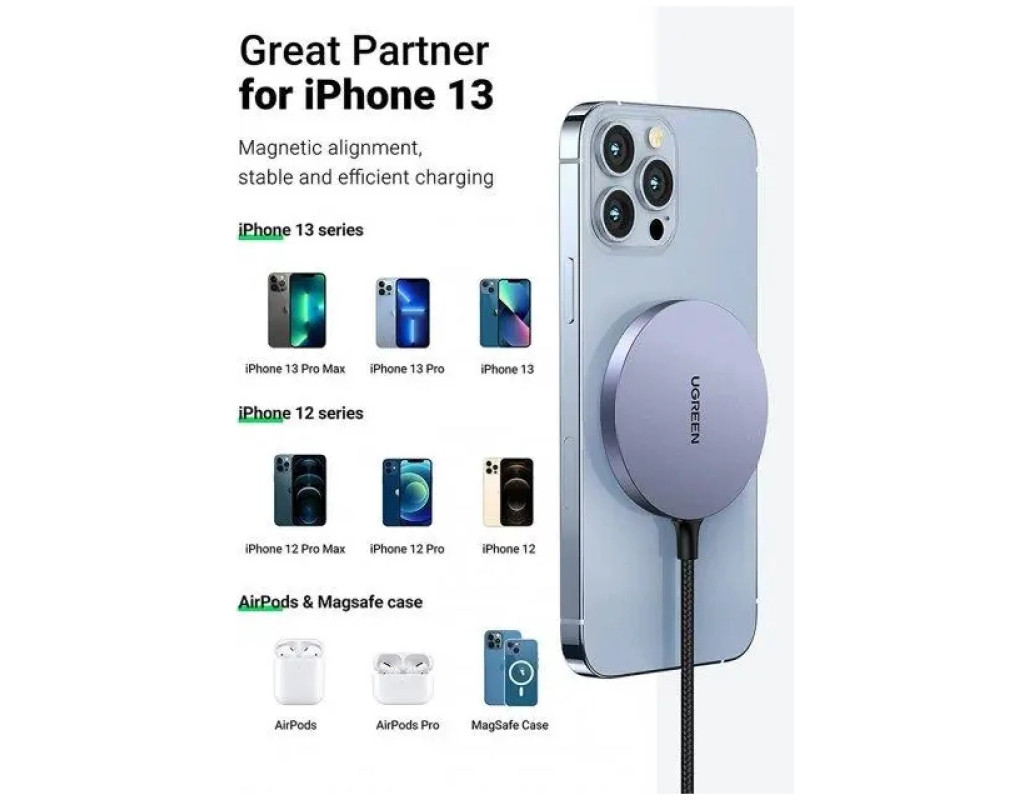 Магнитная зарядка Магнитное беспроводное зарядное устройство UGREEN с идеально расположенными магнитами стыкуется с вашим iPhone 14/14 Pro/14 Pro Max/13/13 Pro/13 Pro Max/13 Mini/12/12 Pro/12 Pro Max/12 Mini и обеспечивает более быструю беспроводную зарядку. Вы можете просто разместить свое устройство в свободном положении, тогда беспроводное зарядное устройство разгонит ваш iPhone до нужной скорости. Универсальная совместимость IPhone 14/iPhone 14 Pro/iPhone 14 Pro Max/iPhone 13/13 Mini/13 Pro/13 Pro Max, iPhone 12/12 Mini/12 Pro/12 Pro Max; with MagSafe case: iPhone 11/11 Pro/11 Pro Max, iPhone SE 3/2/1, iPhone X/XR/Xs/Xs Max, iPhone 8/iPhone 8 plus; Samsung Galaxy S22 Ultra/S22+/S22/S21Ultra/S21+/S21/S20Ultra/S20+/S20/S10/9/8/7/6/5/4, Z Flip 3/Z Fold 3, Note 20/10/9/8, A20/A10e /A52/A51/A50/A70/A71/A80; Huawei Mate Xs/40/30,P40/P30/P20; Google Pixel 6a/6Pro/6/5a/5/4a/4XL/4/3aXL/3a/3/2XL/2/XL/1; Moto G6 G7; Xiaomi 11/10/9/8/MIX FOLD/MIX 4; AirPods series; and all other Qi-enabled devices Качественный корпус Изысканный матовый корпус из алюминиевого сплава улучшает рассеивание тепла, а цвет «серый космос» идеально сочетается с серией iPhone. Высококачественный и прочный зарядный кабель в нейлоновой оплетке прошел испытание на изгиб 15 000 раз. Безопасный и надежный Магнитное беспроводное зарядное устройство оснащено высококачественной металлической пластиной и огнестойкой крышкой для ПК, а также интеллектуальным чипом для защиты от коротких замыканий, перенапряжения, перегрева и перегрузки по току. Маленький и легкий Толщина этого беспроводного зарядного устройства составляет всего 6 мм, поэтому его легко носить с собой, когда оно вам нужно на улице. Отлично подходит для использования в автомобиле или в сумке для путешествий. |