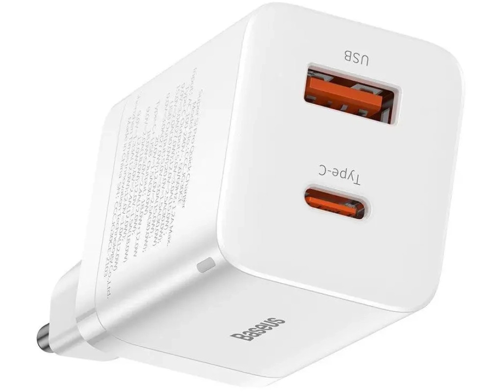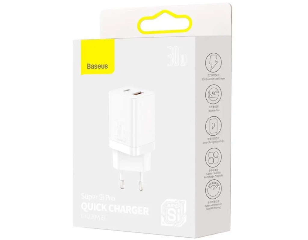 | Сетевой адаптер Baseus Super Si Pro Quick Charger QC3.0+PD3.0 30W USB+Type-C 3A – это компактный, удобный, элегантный и стильный девайс, изготовленный из высококачественных материалов. Данное зарядное устройство имеет 1 USB (USB QC3.0) 1 Type-C (USB Type-C PD3.0) мощностью 3A, оба порта поддерживают технологию быстрой зарядки и помогут Вам быстро заряжать различные девайсы, а максимальная выходная мощность зарядки достигает 30 Вт. Зарядное устройство поддерживает современные стандарты быстрой зарядки – Quick Charge 3.0, Power Delivery 3.0 (Apple), Apple 2.4, BC1.2 и другие, благодаря которым процесс восстановления заряда Ваших аксессуаров ускоряется в несколько раз. Сверхкомпактный адаптер Baseus Super Si Pro Quick Charger с помощью технологии Power Delivery 3.0 18W, восполняет заряд iPhone 11 на 50 процентов всего за 30 минут, а c помощью технологии Power Delivery 3.0 30W понадобиться около 2 часов для полной зарядки iPad Pro 2021. Apple рекомендует Power Delivery для быстрой зарядки смартфонов iPhone 8 и более поздних моделей. Обратите внимание, что для этого вам понадобится использовать кабель Baseus с поддержкой PD. Зарядка Baseus Super Si Pro Quick Charger обладает продуманной конструкцией, которая позволяет одновременно подключать два устройства для зарядки без каких-либо трудностей. Благодаря использованию фирменной технологии Super Si производителю удалось уменьшить зарядное устройство, при этом гарантированно обеспечив быструю и надежную работу адаптера при высоких температурах. Super Si представляет собой новый тип полимера на основе кремния, который имеет преимущества с точки зрения преобразования плотности, теплопроводности и эффективности. Термостойкий материал позволяет внутреннему теплу моментально рассеиваться с наружной поверхности корпуса и поддерживать нормальную рабочую температуру даже в тяжелых условиях эксплуатации. Интегрированный интеллектуальный чип гарантирует защиту от прекращения питания, а для безопасной зарядки подключаемых устройств с различными потребностями в мощности предусмотрена автоматическая регулировка требуемого тока. Быстрая зарядка QC 3.0 - через USB порт оранжевого цвета. Осуществляется по стандарту Quick Charge 3.0. Благодаря этому гаджеты заряжаются почти в четыре раза быстрее обычной зарядки и на 12 процентов быстрее QC 2.0. Обратите внимание, что заряжаемое устройство тоже должно поддерживать Quick Charge 3.0. Если нет – в этом случае зарядка будет происходить в обычном режиме. Быстрая зарядка PD 3.0 – с помощью порта Type-C будет осуществляться по технологии Power Delivery. Этот стандарт фирма Apple рекомендует для быстрой зарядки смартфонов iPhone 8 и более поздних моделей. Обратите внимание, что заряжаемое устройство должно быть подключено с помощью кабеля, поддерживающего стандарт PD. Зарядное устройство Baseus Super Si Pro Quick Charger имеет стильный и эргономичный дизайн, внешний корпус изготовлен из огнеупорного поликарбоната, который устойчив к высоким температурам и внешним повреждениям. Для безопасности Ваших гаджетов, в устройство встроено 6 уровней интеллектуальной защиты: от перегрузки по силе тока, перезаряда, перегрева, перегрузки, различных перенапряжений, коротких замыканий. Зарядный адаптер Baseus Super Si Pro Quick Charger прошел тесты безопасности и имеет сертификаты: CE, FCC, RoHS. Подключение к центральной энергосети осуществляется при помощи евровилки, поддерживается напряжение на входе от 110 до 220 В. Блок питания Baseus Super Si Pro Quick имеет интеллектуальную си