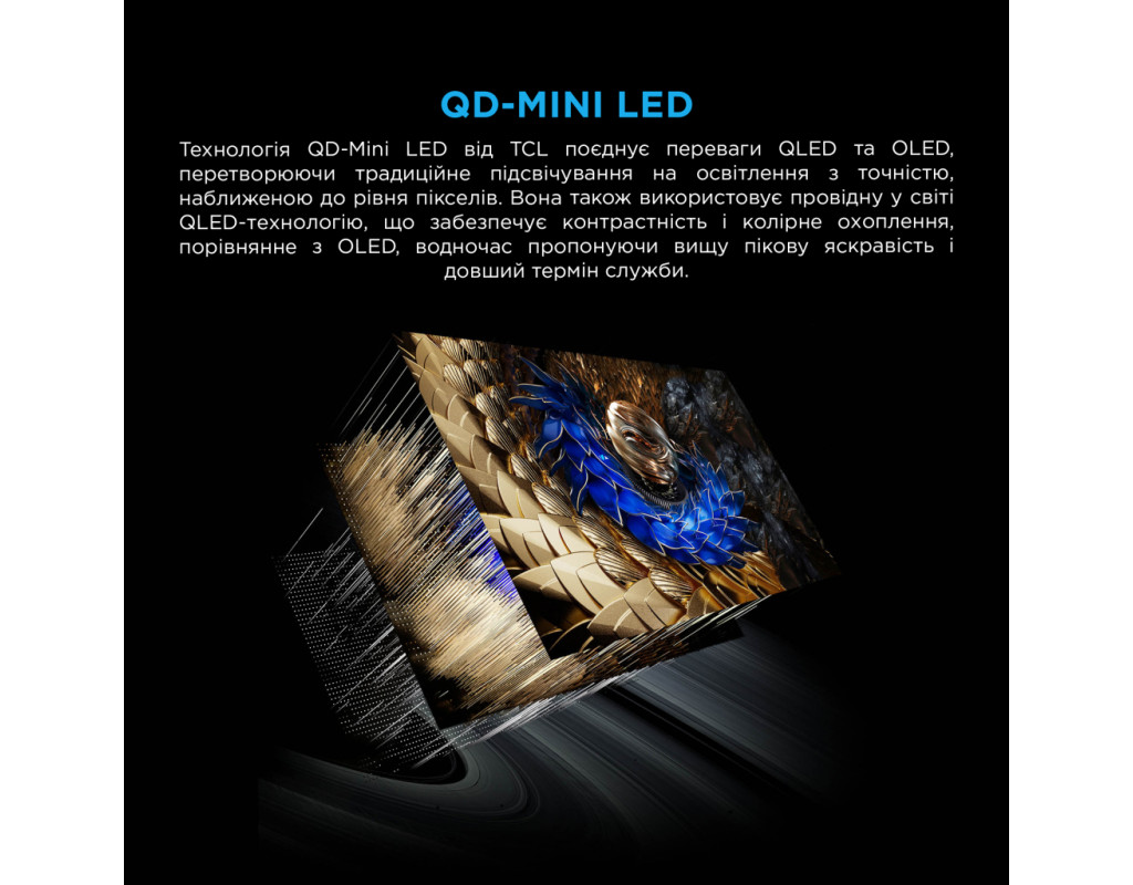QD-Mini LED от TCL сочетает в себе преимущества технологий QLED и OLED, превращая традиционную подсветку в освещение, близкое к точности на уровне пикселей. В ней также используется ведущая в мире технология QLED, обеспечивающая контрастность и цветовую гамму, сравнимую с OLED, а также более высокую пиковую яркость и длительный срок службы. Это технология будущего для больших дисплеев.