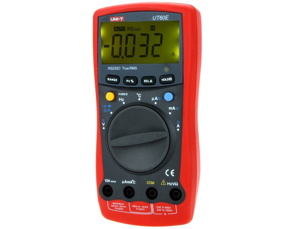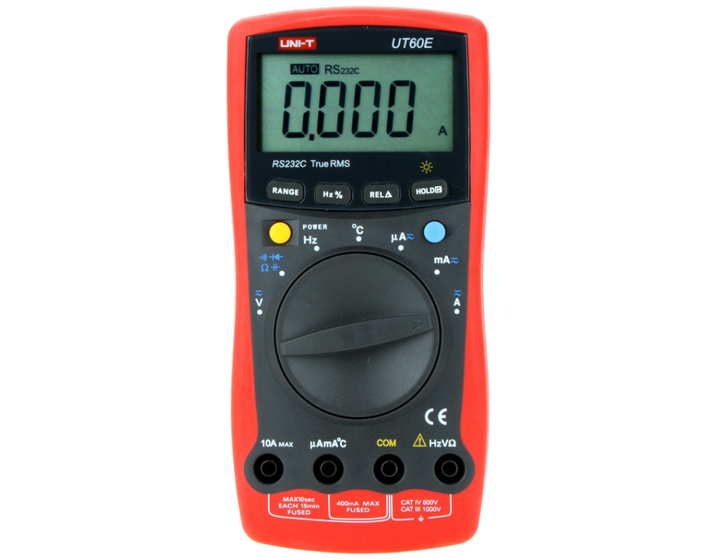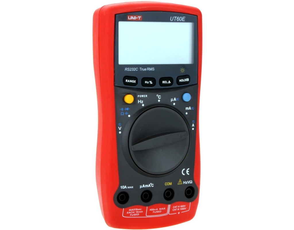Мультиметр-автомат UT60E – цифровой измерительный прибор от компании UNI-T. TRUE RMS. Автоматический выбор диапазонов измерений. Большой экран с подсветкой. Измеряет все основные параметры, в том числе емкость, частоту и скважность. Отличный мультиметр для продвинутых любителей и профессиональных радиотехников. Особенность цифрового мультиметра UNI-T UT60E:В серии измерительных приборов UT60 от UNI-T, мультиметр-автомат UT60E обладает расширенными измерительными функциями, высокой точностью измерения, надежностью и компактностью, присущих данной торговой марке. КонструкцияБольшой экран с подсветкой. В верхней части лицевой панели находится крупный экран. Он четко отображает все измерения. В условиях плохого освещения поможет функция подсветки экрана. Под ним находятся функциональные кнопки. Автоматический переключатель режимов. По центру устройства расположен большой поворотный переключатель всего на 7 положений, что всегда выгодно отличает мультиметры-автоматы. Он обладает мягким переключением, отсутствием характерных громких “щелчков” и четкой фиксацией в каждом положении. Защитный чехол. По всему периметру защищен прочным пластиком красного цвета традиционного для компании. Едва видимое визуальное сжатие с краев делает удержание прибора в руке очень удобным. Второй вариант использования мультиметра – на специальной подставке на задней панели корпуса, легко устанавливающейся под углом одним пальцем. Там же в нижней части находится серийный номер изготовителя. Проводимые измеренияЦифровой мультиметр UNI-T UT60E обладает расширенным функционалом. TRUE RMS. Рассматриваемый измерительный прибор оснащен функцией измерения истинных среднеквадратических значений. Это позволяет получать максимально точные результаты. Он способен измерять: Как и у большинства мультиметров данная модель обладает возможностью проверять диоды, осуществлять прозвонку электрической цепи, обладает функциями индикации разряда, переполнения. Подключение к ПК. Мультиметр UNI-T UT60E способен подключаться к персональному компьютеру. Таким образом можно передавать полученные результаты, а также обрабатывать их при помощи специального программного обеспечения. Защита от перегрузки. В рассматриваемом приборе реализована защита при помощи предохранителя до 10А. |