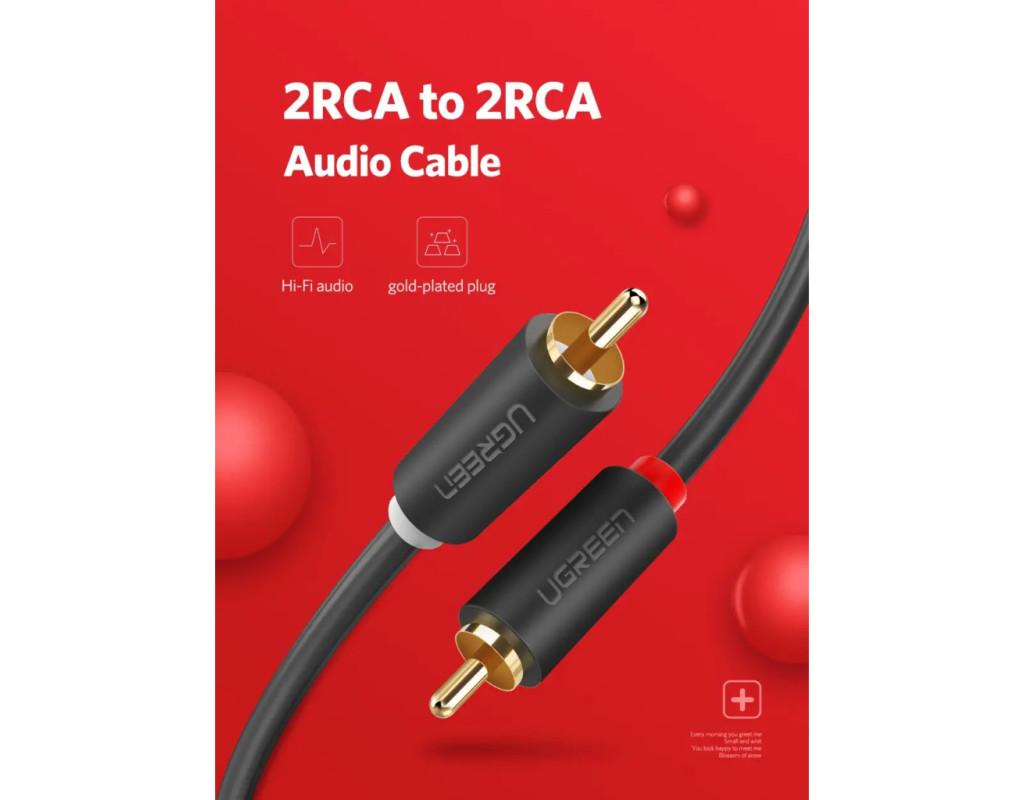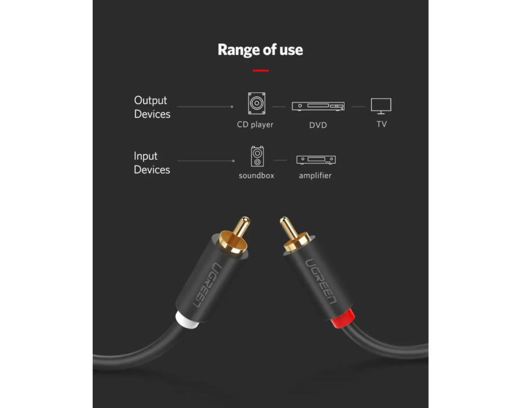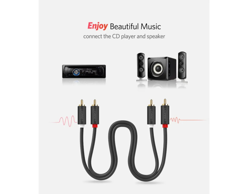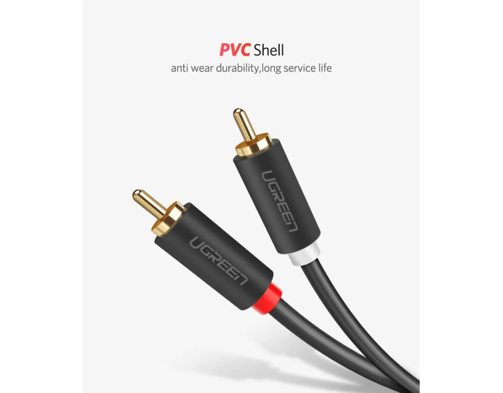 Кабель UGREEN AV104 2RCA to 2RCA Audio Cable, 1 m Black 30747 UGREEN AV104 2RCA to 2RCA Audio Cable – стереофонический аудиокабель – хороший выбор для домашнего кинотеатра, HDTV, игровых консолей, систем hi-fi, усиливая качество звука для более приятного звучания. Позолоченные коннекторы предназначены для улучшения передачи аудиосигнала и уменьшения помех. RCA – отличная альтернатива для аудио/видео устройств, где новые типы соединений недоступны. Продукция Ugreen сертифицируется в соответствии с самыми строгими нормами качества стран Евросоюза (ISO, RoHS, TUV, VDE и т.д.). Уверенность как выпускаемые изделия стала предпосылкой для предоставления пожизненной гарантии на весь ассортимент кабельной продукции торговой марки Ugreen. Характеристики: