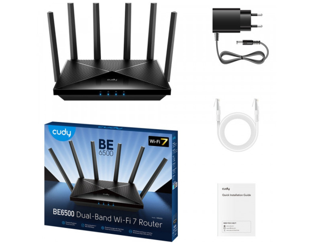 Cudy WR6500 - Wi-Fi7 маршрутизатор, який працює у двох частотних діапазонах - 2,4 ГГц зі швидкістю 688 Мбіт/с та 5 ГГц зі швидкістю 5,7Гбіт/с. Маршрутизатор підтримує підключення до 200 пристроїв на площі до 140 м2. Із технологією Multi-Link Operation маршрутизатор встановлює з’єднання з пристроями одночасно у двох діапазонах Wi-Fi, що робить обмін даними швидким і стабільним. Потужний чотириядерний процесор Broadcom та оперативна пам’ять об’ємом 512 МБ забезпечують миттєву реакцію та плавну роботу навіть при підключенні декількох пристроїв. Шість фіксованих Wi-Fi антен у поєднанні з чотирма потужними FEM-модулями (Front-End Modules) та технологією Beamforming формують сильніші та більш сфокусовані сигнали Wi-Fi для бездоганного покриття. Чотири гігабітних LAN порти та один WAN порт дають змогу здійснювати дротове підключення до мережі вашого ПК, ТБ, ігрових консолей, NAS та інших пристроїв. Вбудовані клієнти VPN - PPTP, L2TP, Wire Guard, Open VPN дають можливість маршрутизатору легко встановлювати з’єднання з сервером VPN для передачі всіх ваших онлайн-даних і трафіку, захищаючи їх при цьому за допомогою шифрування. Керуйте доступом до Інтернету для дітей - встановлюйте розклади та блокуйте певні домени. Формуйте чорний список доменів або IP-адрес щоб захистити інформаційне середовище ваших дітей. Cudy WR6500 підтримує дистанційне хмарне керування та локальне керування через додаток Cudy. |