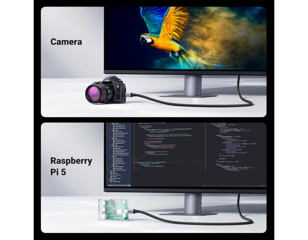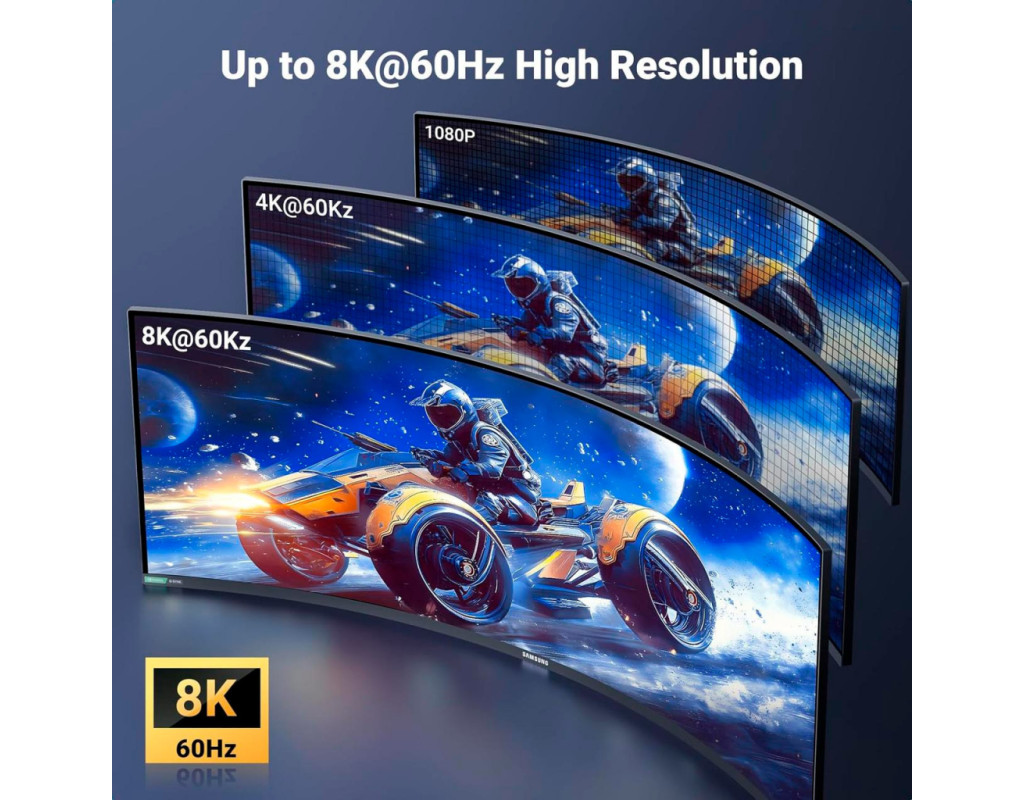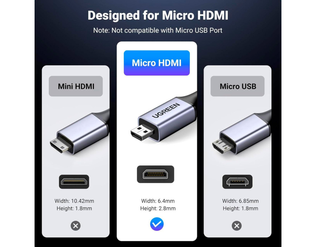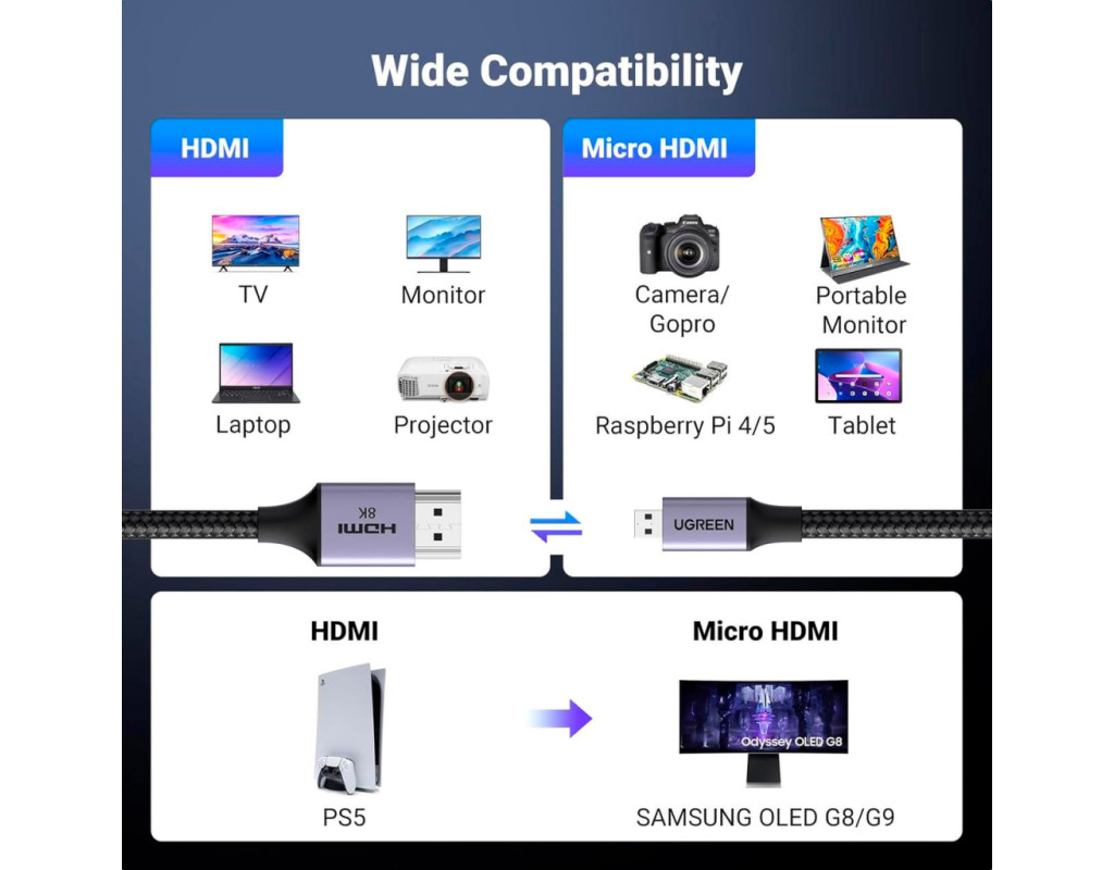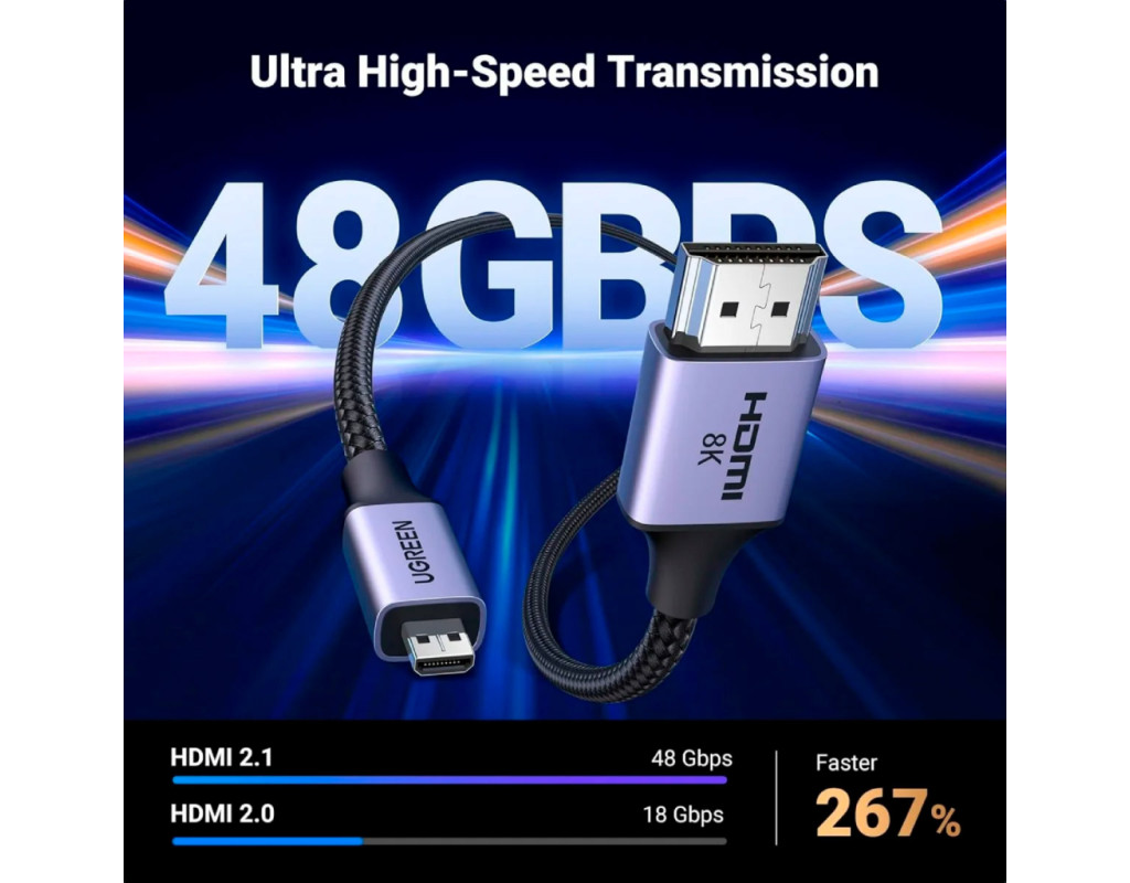 | Кабель Micro-HDMI 8K-60 Гц - HDMI Кабель Micro-HDMI Ugreen поддерживает разрешение Full HD 8K-60 Гц, 4K-240 Гц и 4K-144 Гц. Он поможет вам транслировать аудио и видео с камеры, планшета или ноутбука через порт Micro HDMI на ваш HDTV или проектор с портом HDMI. Примечание: обратите внимание на интерфейс вашего устройства, порт micro HDMI, а НЕ mini HDMI или micro USB. Высокая скорость и стабильная передача Скорость передачи 48 Гбит/с и обратный аудиоканал обеспечивают несжатый многоканальный цифровой звук, высокоскоростную передачу без потери сигнала. Проводники из луженой меди 32AWG обеспечивают этому микро HDMI-кабелю превосходную проводимость. Тройное экранирование эффективно защищает от электромагнитных помех, обеспечивая более стабильную передачу сигнала. Благодаря позолоченным разъемам этот высокоскоростной 2.1 micro HDMI-адаптер обеспечивает более длительный срок службы. Модернизация материала для большей прочности Нейлоновый плетеный провод, улучшенный на ощупь, более устойчив к износу, не боится тяги домашних животных и может выдерживать более 25 000 сгибаний. Плюс алюминиевая оболочка, большее рассеивание тепла и коррозионная стойкость, что делает наш провод более прочным. Двунаправленный и поддерживает Dynamic HDR Этот кабель 8K HDMI to micro HDMI поддерживает двустороннюю передачу. Он также поддерживает Dynamic HDR/3D, HDR, Dolby Atmos и eARC, которые обеспечивают превосходное изображение и чистый захватывающий объемный звук для кинематографического видеопиршества. Широкая совместимость Совместимо с Raspberry Pi 5, Raspberry Pi 4, GoPro Hero 7 Black, Samsung G8 OLED, G9 OLED, Hero 6 Hero5, Hero 4 Silver, Hero 3 White, Hero3+, Go Pro Hero 2018, портативным монитором, Retroid Pocket 3+/3, камерой, Nikon b500, EOS M50, планшетом IdeaPad Miix 300, ThinkPad 10 8, ультрабуком Yoga 2 Pro 3, Yoga 700 710, 710s, картой видеозахвата. Примечание: этот кабель Micro HDMI 2.1 не подходит для телефонов или планшетов Samsung с портом Micro-USB |