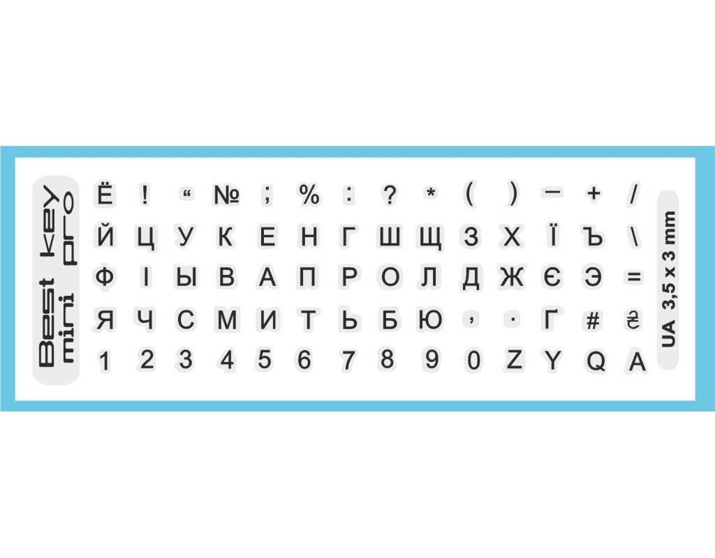 Наклейка на клавіатуру Best key mini Pro 3,5х3 мм. Наклейка на клавіатуру універсальна прозора з чорними літерами. Виготовлена по спеціальній технології яка забезпечує не стирання літер. Основа матова прозора 4х3,5 мм. Вирізана по контуру літер. Підходить для клавіатур з підсвіткою. В наклейках є 70 клавіш розміром 3,5х3 мм. які виготовлені з м’якої ПВХ плівки. Корлір основи: прозорий Колір букв кирилиці: чорний Розмір літер 3,5х3 мм. |