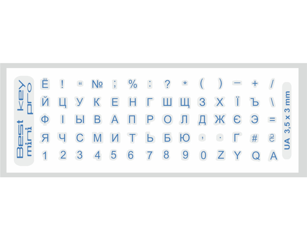Наклейка на клавиатуру Best key mini Pro 3,5х3 мм. Наклейка на клавиатуру универсальная прозрачная с синими буквами. Изготовлена по технологии, которая обеспечивает не стирание букв. Основа матовая прозрачная 4x3,5 мм. Вырезаная по контуру букв. Хорошо подходит для клавиатур с подсветкой. На наклейке 70 клавиш изготовленых из мягкой ПВХ пленки. Размер букв 3,5х3 мм. |
