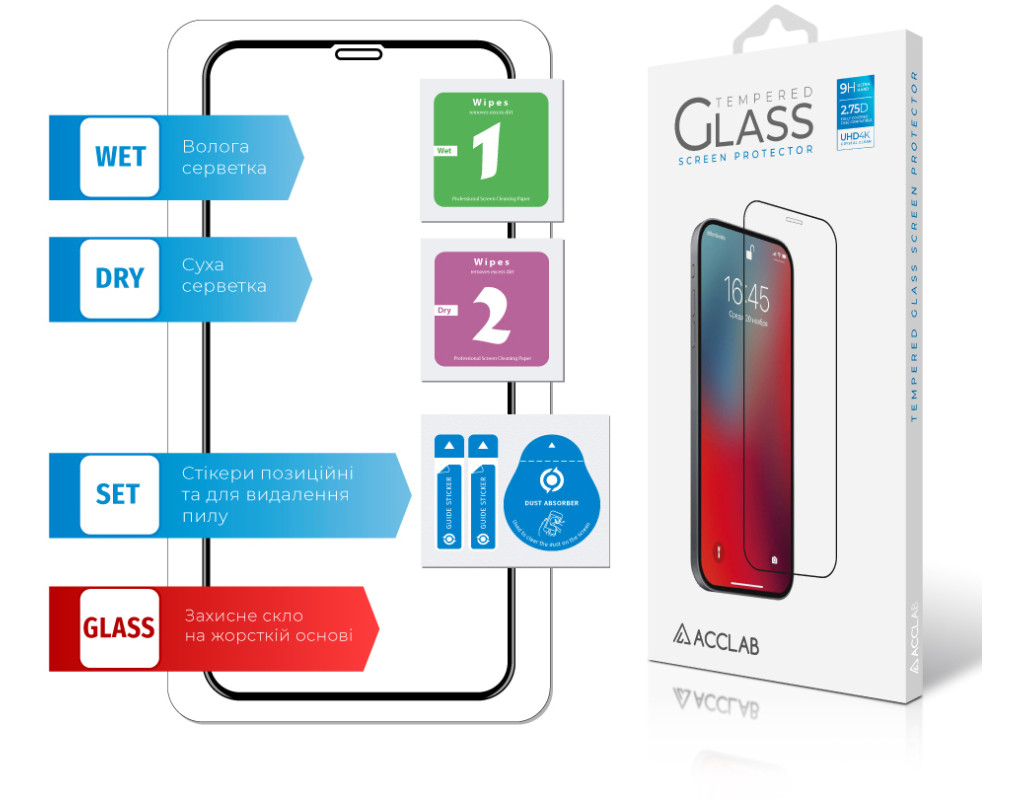 Назначение - для телефона, Вид покрытия - защитное, Совместимость с моделями - Apple iPhone X, Apple iPhone XS, Apple iPhone 11 Pro, Особенности - прочность: 9Н, влажная салфетка, Количество в упаковке - 1 шт