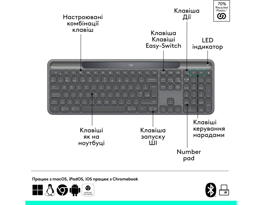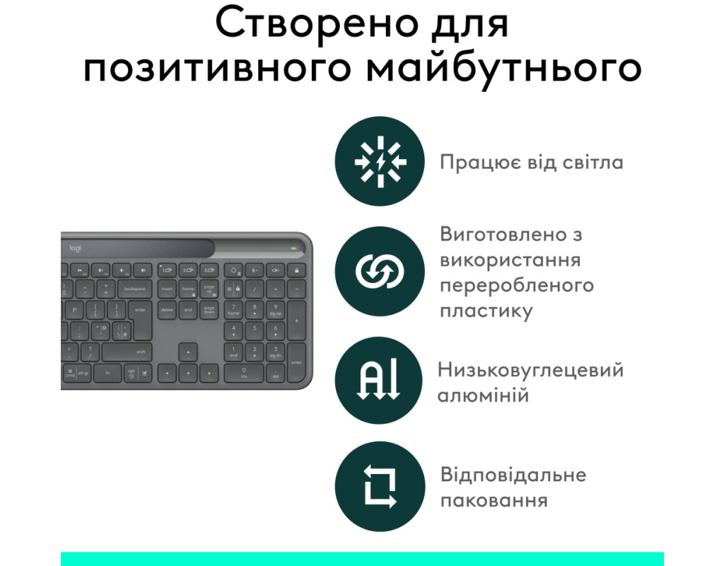 | Клавиатура Logitech Slim Solar+ for Business Wireless/Bluetooth Graphite (920-013779) — это современное решение для тех, кто ценит комфорт и функциональность в работе с ПК. Тщательно спроектированная для многозадачности, эта мембранная клавиатура подключается беспроводным способом через Bluetooth или USB адаптер 2.4 ГГц. Благодаря полноразмерному формату с украинской и английской раскладкой, она обеспечивает удобство и эффективность в любых условиях. Интегрированная инновационная технология Logi LightCharge использует как солнечное, так и искусственное освещение, чтобы питать клавиатуру до четырех месяцев без подзарядки. Материалы изготовления включают экологически чистый переработанный пластик и алюминий, что демонстрирует заботу Logitech о будущем планеты. Этот инструмент обладает отличной долговечностью, рассчитанной на 10 миллионов нажатий клавиш. Возможность легкого переключения между тремя разными устройствами с помощью функции Easy Switch позволяет сохранять организованность вашего рабочего пространства. С приложением Logi Options+ вы сможете автоматизировать рутинные задачи, а функция персонализации клавиш предоставит вам полный контроль над вашим днем. Бесшумная и плавная печать обеспечивает максимальный комфорт и концентрацию, а элегантный дизайн добавит стиля вашему рабочему окружению. |