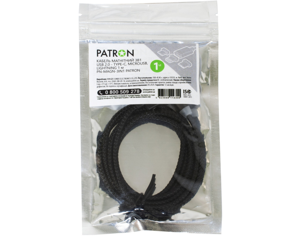 Дата кабель USB 2.0 AM to Lightning + Micro 5P + Type-C 1.0m Patron (PN-MAGN-3IN1)
