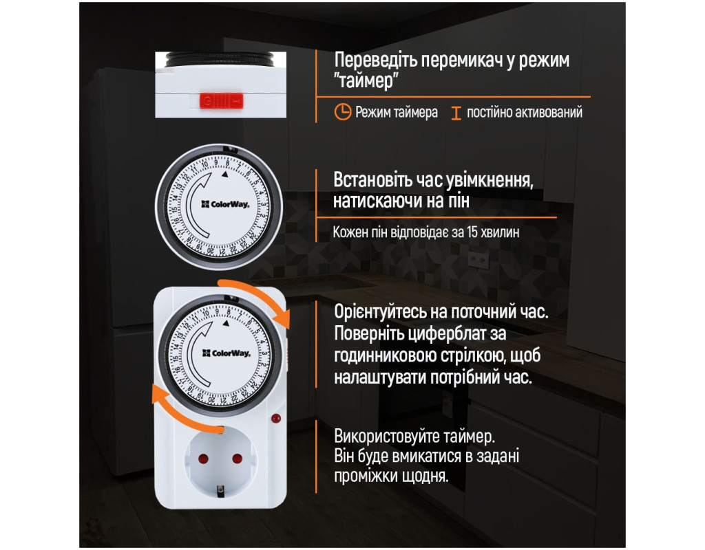 Эта розетка с механическим суточным таймером обеспечивает автоматическое включение и выключение электрических приборов в заданное время в течение суток. Она идеально подходит для управления освещением, бытовой техникой и другими устройствами. Таймер помогает автоматизировать различные процессы, такие как полив растений на даче или регулировка освещения в аквариуме. Розетка оснащена суточным таймером, который позволяет настроить включение и выключение устройств в течение 24 часов с шагом 15 минут. Программа повторяется ежедневно, без необходимости повторных настроек. Основное преимущество этой модели — компактный размер и удобство программирования. Настройте текущее время и желаемые интервалы, затем просто вставьте таймер в розетку. Ваше устройство будет автоматически включаться и выключаться в нужное время. Кроме того, розетка имеет переключатель для отключения функции таймера, что позволяет использовать её как обычную розетку. Таймер-розетка обеспечивает удобное управление энергопотреблением, способствуя экономии. Независимо от того, нужно ли вам включить свет в определенное время или выключить обогреватель перед сном, таймер выполнит эти задачи точно и своевременно, повышая комфорт и безопасность в вашем доме. Таймер-розетку можно использовать в различных ситуациях для автоматизации управления электрическими приборами. Несколько примеров:
