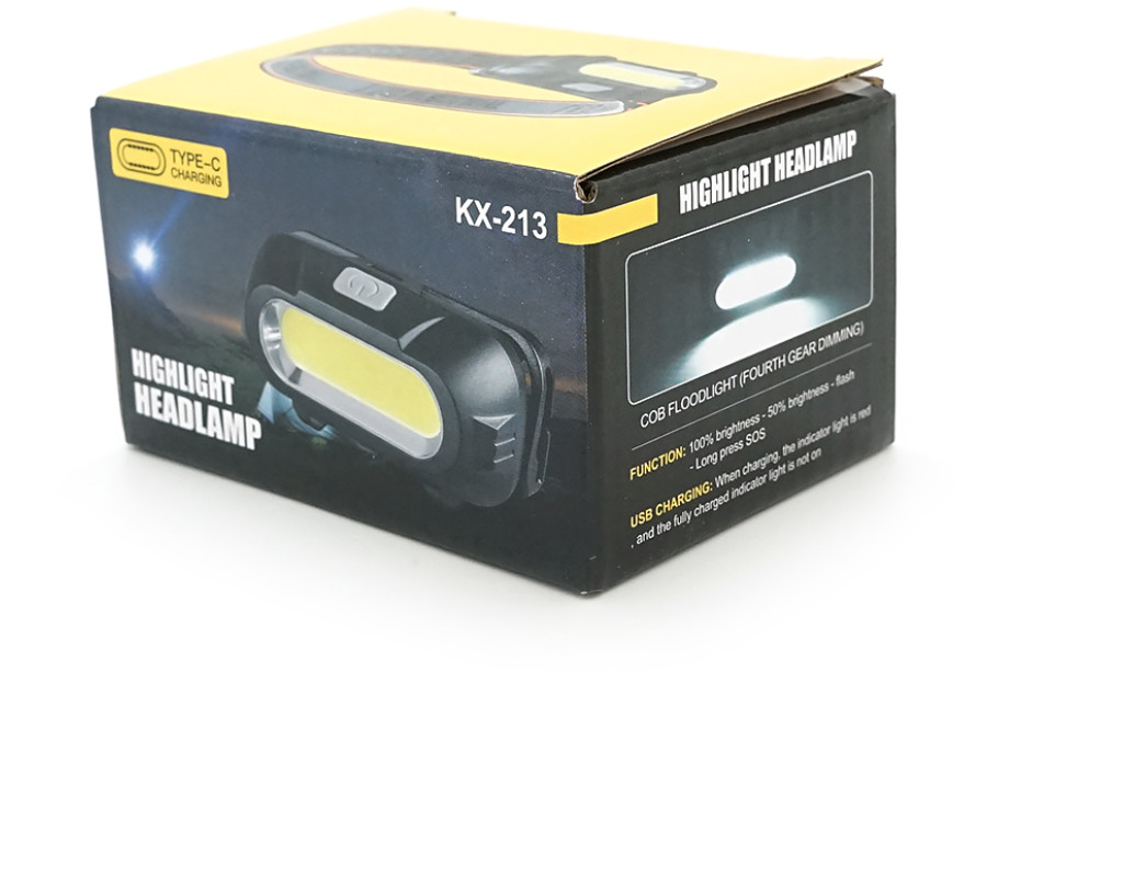 Налобний Ліхтарик KX-213, 3 режими, COB, корпус-пластик, водостійкий, 18650 акумулятор, USB кабель, BOX