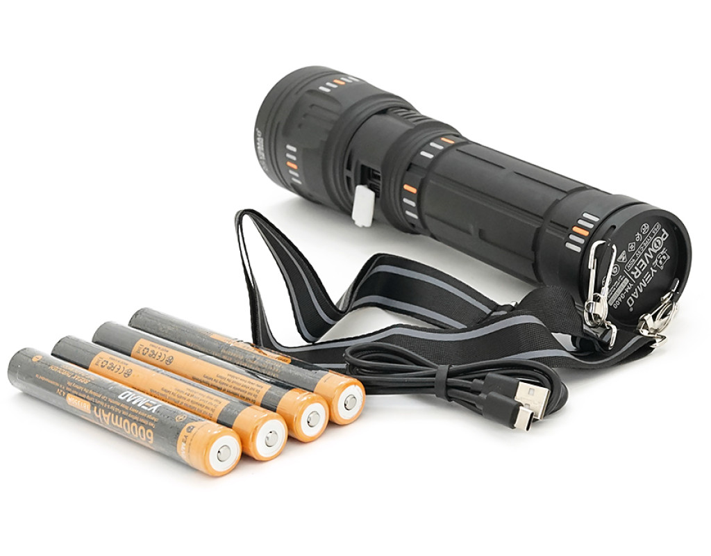 Ліхтар пошуковий YEMAO YM-G600 LED PM60, 4 режими, індикація заряду, живлення від 4(2*18650), IP65, USB кабель, 325х205х100мм, 1,600кг, Black, Чохол+BOX