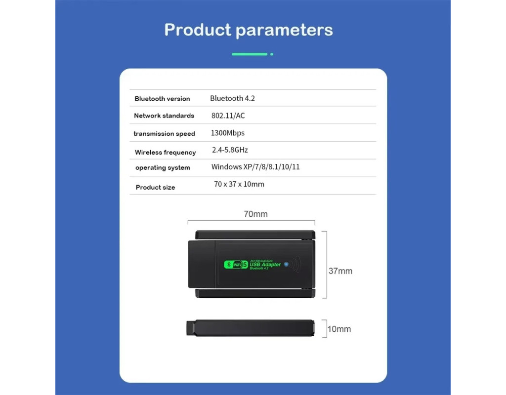 Описание • Двухдиапазонный Wi-Fi 2,4 ГГц и 5 ГГц: наслаждайтесь более быстрым и надежным подключением к Интернету благодаря двухдиапазонному Wi-Fi адаптера. • Интерфейс USB 3.0: ощутите молниеносную скорость передачи данных благодаря интерфейсу USB 3.0 адаптера. • Bluetooth 4.2: легко подключайте устройства благодаря поддержке Bluetooth 4.2 адаптера. • Высокая скорость передачи данных: наслаждайтесь высокоскоростным подключением к Интернету благодаря скорости передачи данных адаптера 1300 Мбит/с. Характеристики: Чип: RTL8821CU Bluetooth 4.2 Мощность передачи 20 дБм (максимальная) Двухканальный сигнал 2,4 ГГц / 5 ГГц; Скорость беспроводного соединения 1300 Мбит/с Поддержка Bluetooth-гарнитуры, колонок, клавиатуры, мыши и других устройств Соответствует стандарту IEEE 802.11ac/n/g/b/a Встроенная интеллектуальная антенная система, мощный сигнал Портативный и простой в использовании Энергосберегающая конструкция, энергосбережение и экологичность Стабильная работа, бесперебойное соединение, возможность совместного использования Wi-Fi Совместимость с основными операционными системами |