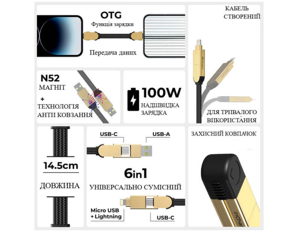 | inCharge X — ультракомпактный кабель, позволяющий передавать данные и производить сверхбыструю зарядку до 100 Вт, а также заряжать устройства Apple до 27 Вт. Благодаря универсальной конструкции 6-в-1 он совместим почти со всеми мобильными устройствами. Идеален для тех, кто ищет компактное решение для быстрой зарядки. inCharge X – универсальный кабель для любых устройств в карманном формате. (модель доступна в трех цветах – черном, синем и бежевом) Особенности: