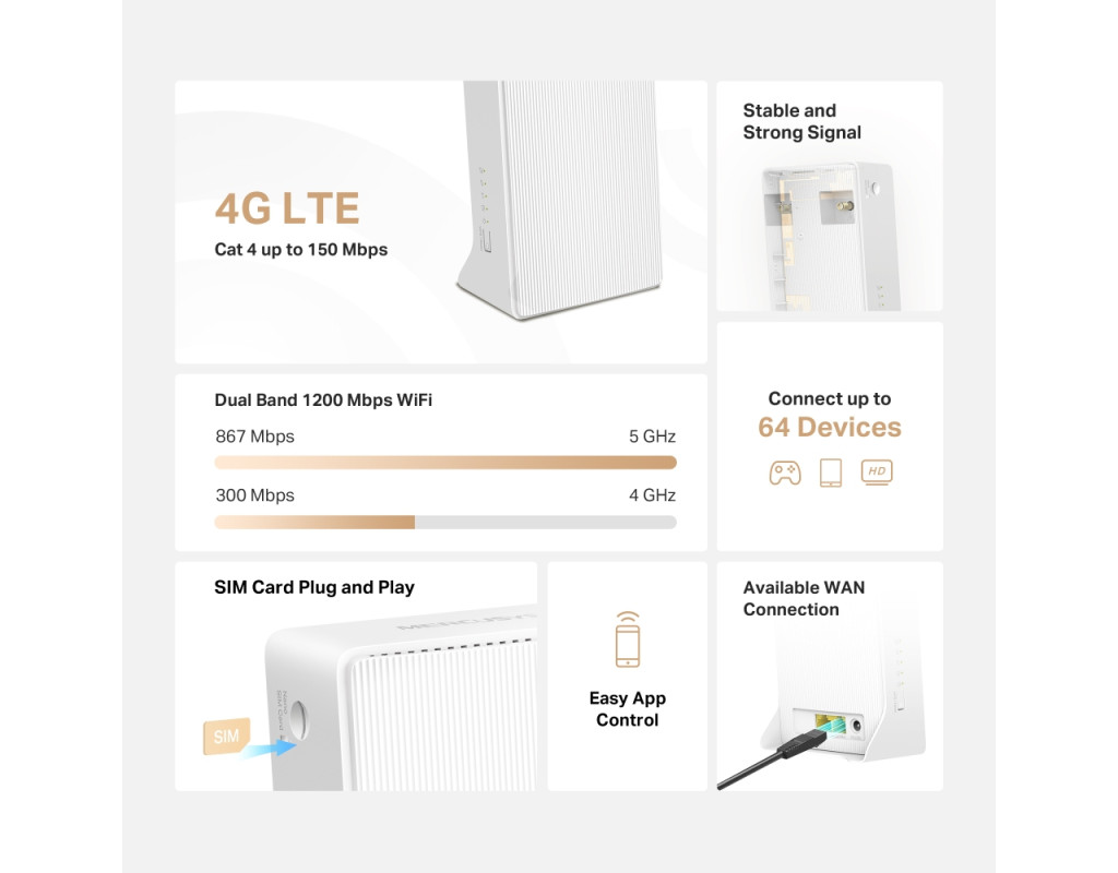 | Маршрутизатор Mercusys MB130-4G — это идеальное решение для тех, кто ценит качество и скорость беспроводного соединения. Благодаря поддержке 4G LTE, он обеспечивает подключение со скоростью до 150 Мбит/с, что делает просмотр видео и загрузку файлов мгновенными. Поддержка двухдиапазонного Wi-Fi позволяет вам наслаждаться стабильной передачей данных со скоростью до 300 Мбит/с на частоте 2,4 ГГц и до 867 Мбит/с на 5 ГГц, что обеспечивает бесперебойную работу до 32 устройств одновременно. Для удобства использования, маршрутизатор требует лишь вставки Nano SIM-карты без дополнительных настроек. Два разъема для внешних антенн гарантируют улучшенное качество приема мобильного сигнала, что позволяет оставаться на связи в любых условиях. |