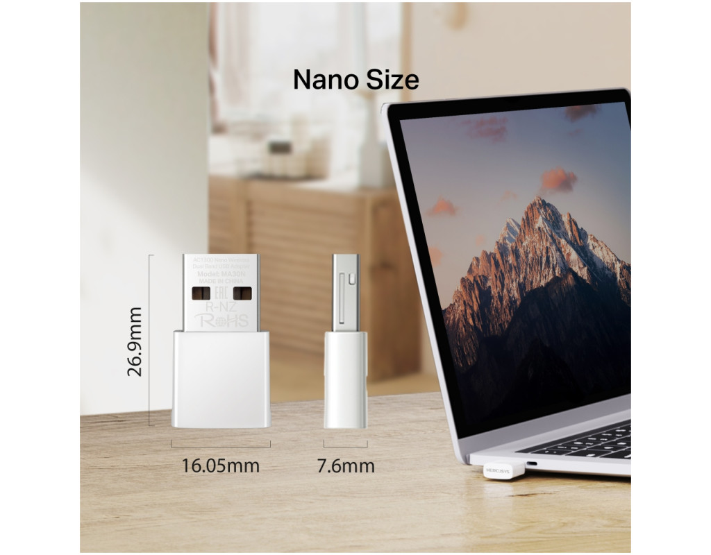 | Wi-Fi адаптер MERCUSYS MA30N AC1300 — компактный двухдиапазонный USB-адаптер (Nano) со скоростью до 867 Мбит/с на 5 ГГц и 400 Мбит/с на 2,4 ГГц. Оснащён внутренней антенной, поддерживает WPA3 для усиленной защиты. Совместим с Windows 10/11, подключение через USB 2.0. |
