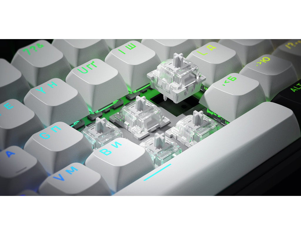 Double-shot PBT кейкапы Эргономично сформированные колпачки с полноценной подсветкой обеспечивают приятную тактильность и долговечность.