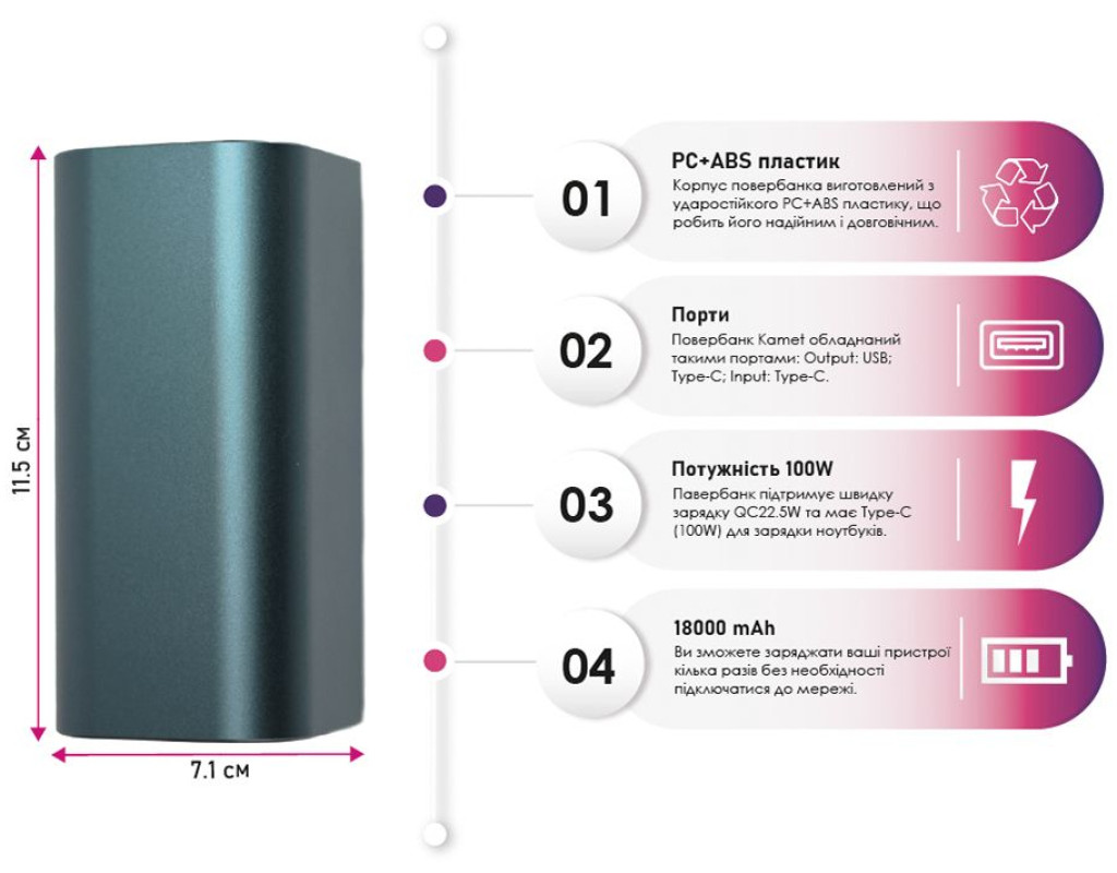 Повербанк Kamet – это высокопроизводительное зарядное устройство, идеально подходящее для зарядки ноутбуков, смартфонов, планшетов и других электронных гаджетов. Благодаря емкости 18000 mAh вы сможете заряжать ваши устройства несколько раз без необходимости подключаться к сети. Павербанк поддерживает технологию быстрой зарядки QC22.5W и имеет разные выходные порты, включая Type-C с выходной мощностью до 100W, что позволяет эффективно заряжать даже ноутбуки. Модель оснащена цифровым дисплеем, показывающим уровень заряда, напряжение и силу тока, что позволяет точно контролировать процесс зарядки. Корпус повербанка изготовлен из ударопрочного пластика PC+ABS, что делает его надежным и долговечным, а компактные размеры 115x70.5x26.5 мм обеспечивают удобство при транспортировке. |