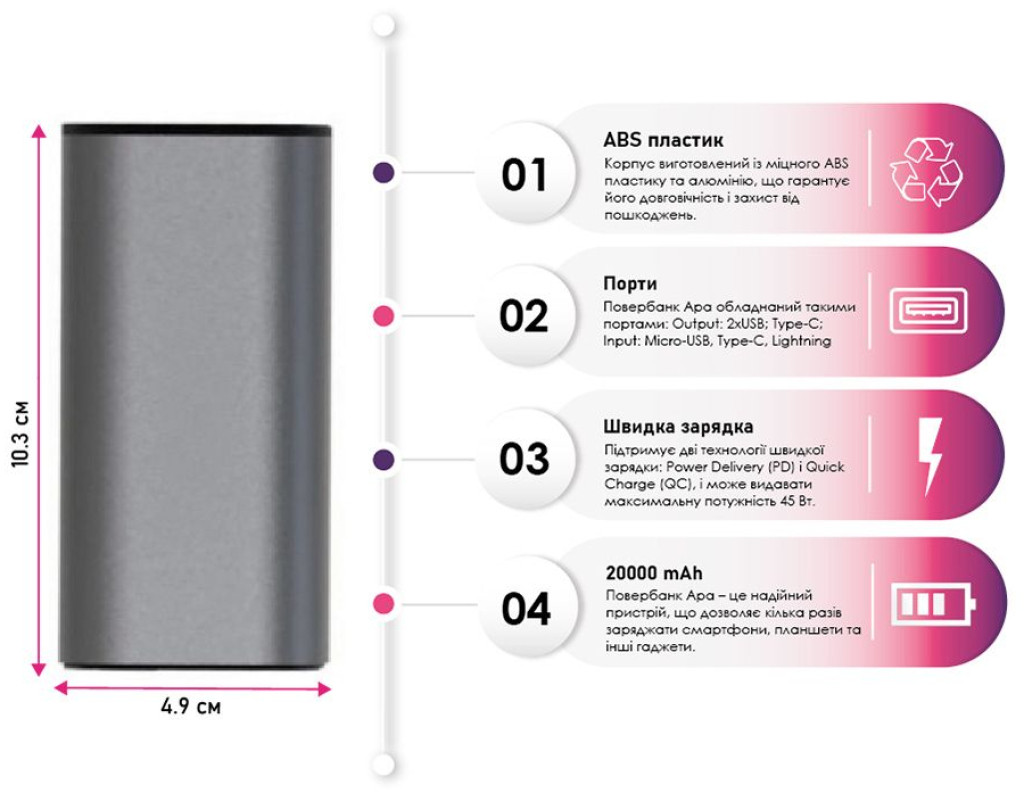 | Повербанк Apa – це надійний пристрій з ємністю 20000 mAh, що дозволяє кілька разів заряджати смартфони, планшети та інші гаджети. Павербанк підтримує швидку зарядку через порти Type-C, Micro USB та Lightning, що робить його сумісним із широким спектром пристроїв. Корпус виготовлений із міцного ABS пластику та алюмінію, що гарантує його довговічність і захист від пошкоджень. Незважаючи на високу ємність, розміри 49x49x103 мм роблять його зручним для перенесення, тому він легко поміститься у сумці або рюкзаку, забезпечуючи заряд у будь-який момент. |
