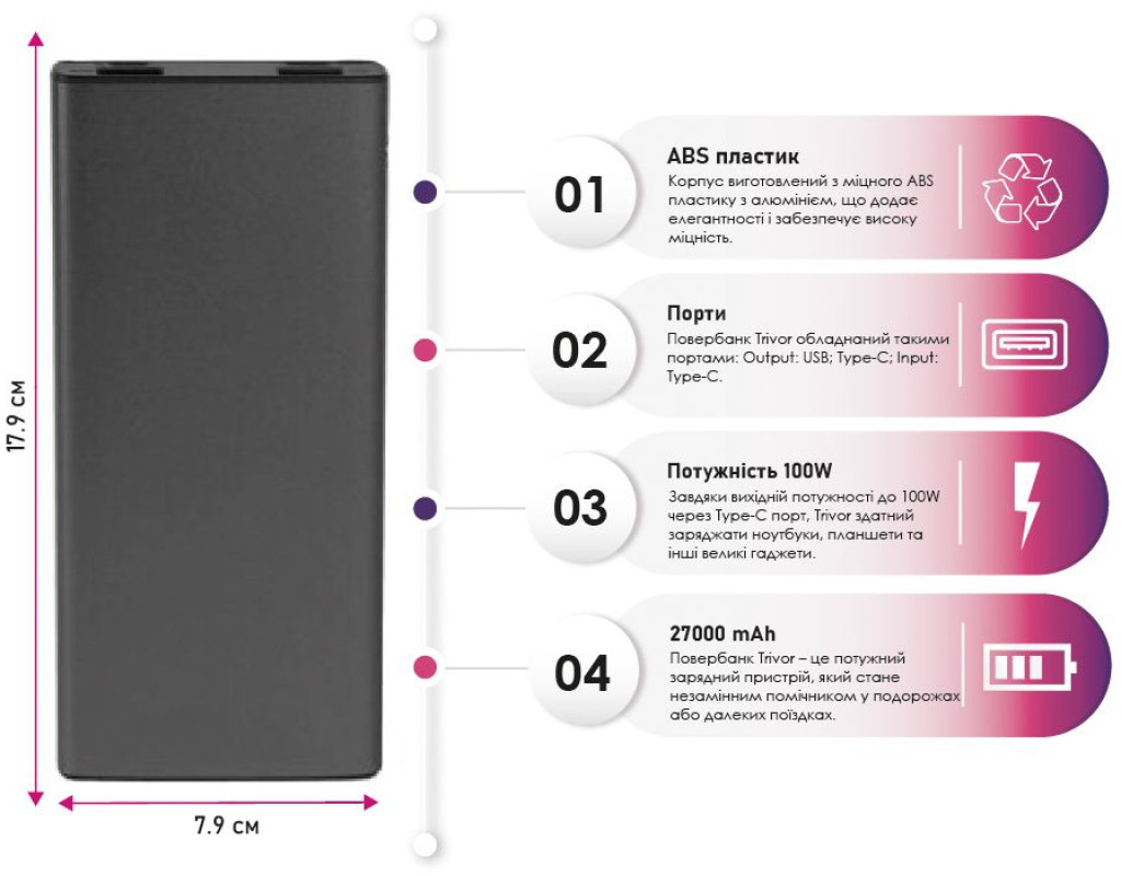 Повербанк Trivor – это мощное зарядное устройство с емкостью 27000 mAh, которое станет незаменимым помощником в путешествиях или дальних поездках. Повербанк поддерживает быструю зарядку QC22.5W, что позволяет заряжать ваши устройства в минимальные сроки. Благодаря выходной мощности до 100W через Type-C порт Trivor способен заряжать ноутбуки, планшеты и другие большие гаджеты. Модель оснащена цифровым дисплеем для удобного отслеживания уровня заряда. Корпус изготовлен из прочного ABS пластика с алюминием, что придает элегантности и обеспечивает высокую прочность. Компактные размеры 179x78.5x26 мм делают этот повербанк достаточно удобным для ношения, даже учитывая его большую емкость. |