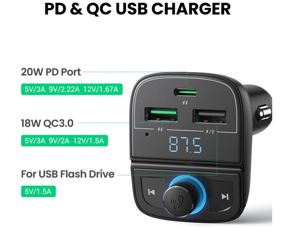 Кристально чистое качество звука с 3 режимами воспроизведения музыки: Bluetooth FM-передатчик Ugreen поддерживает Bluetooth 5.0, SD-карту (≤ 128 Гб) и USB-накопитель (≤ 128 Гб), поэтому вы можете легко наслаждаться стабильной и кристально чистой музыкой на ходу без помех. Поддержка MP3, WAV, APE, FLAC, WMA, ACC и т. д. Огромная мощность зарядки 20 Вт: Bluetooth-передатчик прикуривателя может зарядить ваше устройство, например iPhone 13, с 0 % до 58 % всего за 30 минут. Зарядка через порт USB-C. Порт USB-A поддерживает быструю зарядку QC 3.0 с зарядной мощностью 18 Вт. Таким образом, одновременно можно заряжать 2 устройства. Громкая связь и навигация: с внешним микрофоном ваш оппонент может слышать очень четко и четко. Принять, повесить, отклонить и повторно набрать простым щелчком мыши. Автоматически переключайтесь между входящими вызовами, музыкой и навигацией. Адаптер Bluetooth 5.0 совместим с навигационным приложением на вашем телефоне, чтобы обеспечить безопасное и комфортное вождение. Индикатор перенапряжения автомобильного аккумулятора со светодиодной подсветкой: автомобильный передатчик может определять состояние автомобильного аккумулятора после подключения к прикуривателю. Когда автомобиль перегружен, синий светодиодный круг мигает, чтобы напомнить вам. Универсальная совместимость: автомобильный комплект Bluetooth для громкой связи совместим с iPhone 13, 13 Mini, 13 Pro, iPhone 12, 12 Pro, 12 Pro Max, 11, SE, XR, XS, XS Max, X, 8, iPad Pro 2020/2018, AirPods Pro, Car Phone Holder; Galaxy S20, S21, A51, A50, S10, S9; Huawei P; 30, P30. 0 Pro, P20; Xiaomi Mi 9, 8 |