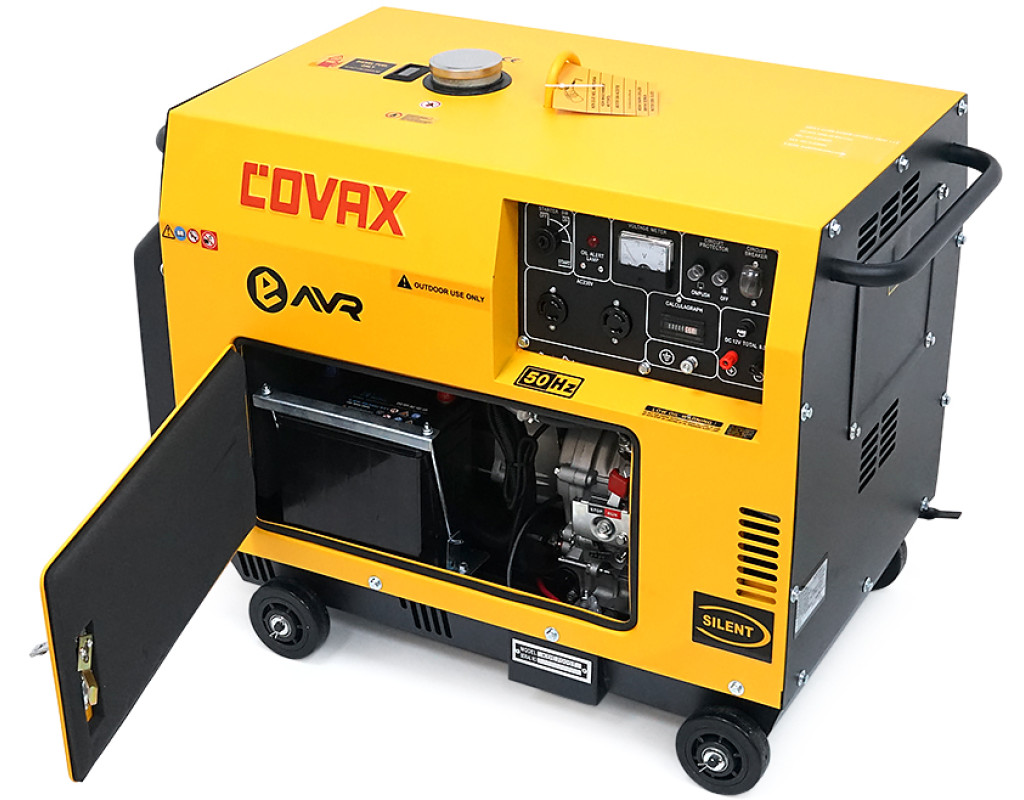 Генератор дизельний COVAX KDE7000T, 1-фазний 230V, 50Hz, 5.0kVA / 4.5kW, бак 15 л, витрата 1-1.2 л / год, пуск: стартер (без АКБ), 920x520x780 мм, 145 кг