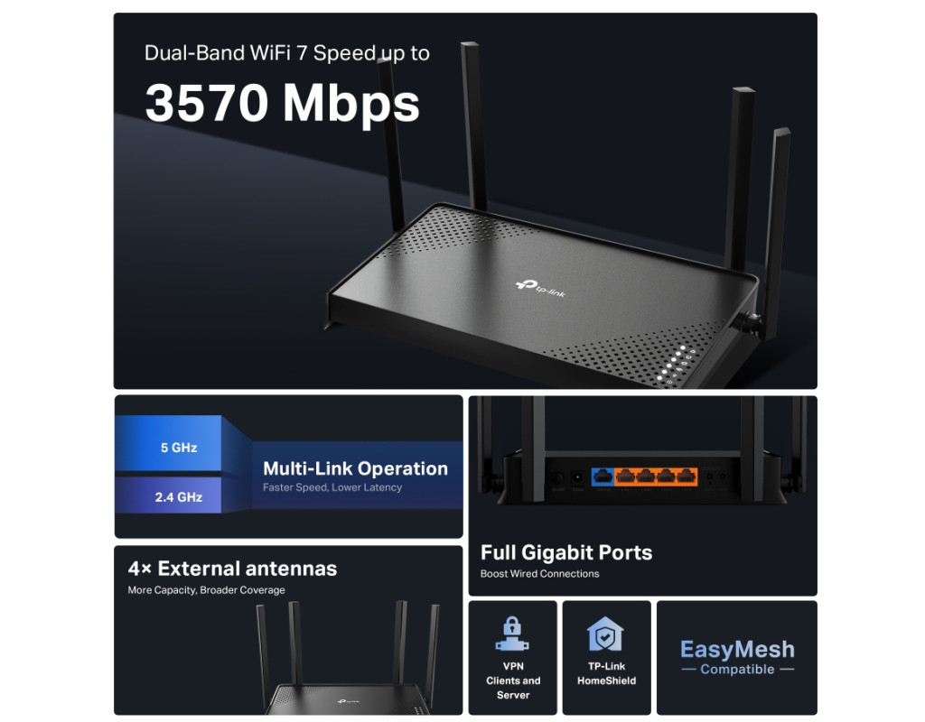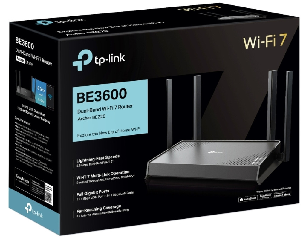 | Вот перевод текста на русский язык: Маршрутизатор TP-Link Archer BE220 (ARCHER-BE220) открывает новую эру беспроводной связи благодаря интеграции с новейшим стандартом Wi-Fi 7. Это устройство предлагает впечатляющую скорость беспроводного соединения до 3.6 Гбит/с, что позволяет наслаждаться бесперебойным потоковым видео в 4K/8K, интенсивными играми в реальном времени и молниеносной загрузкой контента. С поддержкой стандартов Wi-Fi 802.11 g, b, be, ac, n, a и ax, Archer BE220 способен обеспечить безупречную совместимость со всеми вашими устройствами. Оснащённый гигабитными LAN портами, маршрутизатор позволяет подключать ПК, смарт-телевизоры и игровые приставки для максимальной скорости и надёжности проводного соединения. Четыре несъёмные антенны достигают улучшенного покрытия, а технология Beamforming обеспечивает целенаправленное фокусирование сигнала на ваших устройствах. Совместимость с EasyMesh позволяет гибко формировать сеть Wi-Fi по всему дому, добавляя дополнительные маршрутизаторы или усилители сигнала. TP-Link HomeShield гарантирует защиту вашей сети, данных и конфиденциальности. Настройка стала проще благодаря приложению Tether, которое позволяет быстро и легко настроить сеть и обеспечить мощный сигнал в вашем доме. |