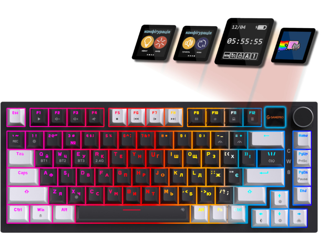 Клавиатура оснащена TFT-дисплеем, отображающим активный режим подключения, уровень заряда батареи, выбранный профиль, эффекты подсветки и другие ключевые параметры. Это удобный инструмент для контроля клавиатуры без дополнительного софта, что делает ее более функциональной во время игры или работы.
