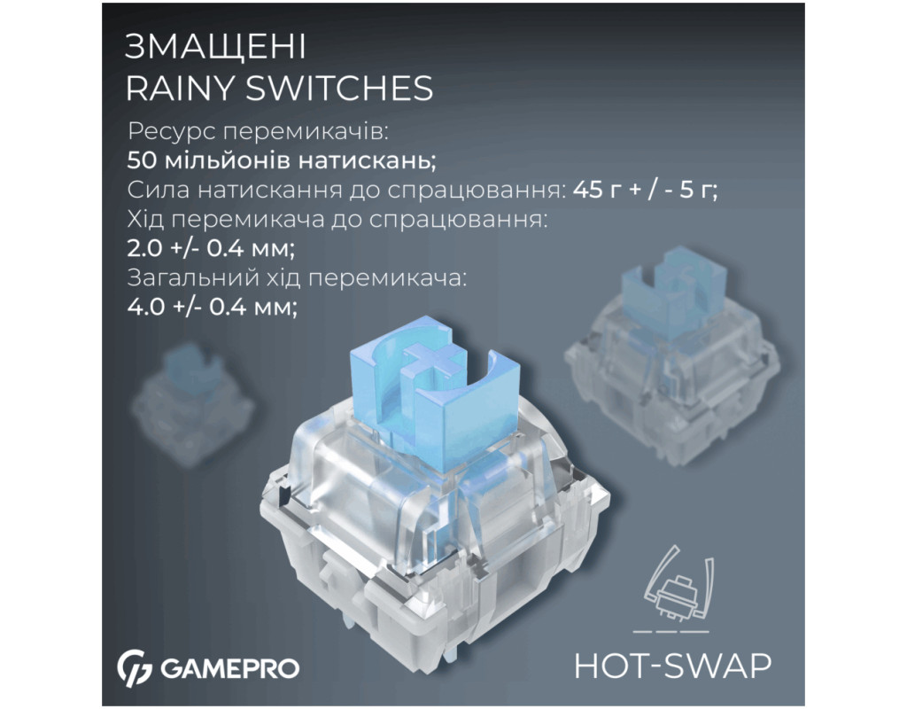 Модель оснащена механическими переключателями Rainy, предварительно смазанными на заводе с поддержкой Hot-Swap, что позволяет легко заменять переключатели. Благодаря этому клавиатура обеспечивает плавный ход и комфортное нажатие как в игре, так и при наборе текста.
