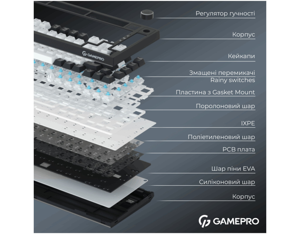 Сердце девайса — линейные свитчи Rainy с заводской смазкой и Hot-Swap: меняй переключатели за секунды без паяльника. Плавный ход, чёткий отклик, ресурс 50+ млн нажатий. Gasket Mount + смазанные стабилизаторы = мягкий, «кремовый» звук и ноль вибраций даже на максимальных скоростях.