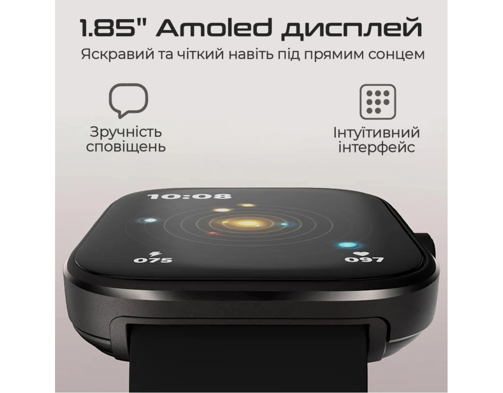 • Amoled дисплей с диагональю 1.85": С разрешением 390х450р, обеспечивает яркое и четкое изображение. Комфортный просмотр уведомлений и времени без напряжения для глаз.