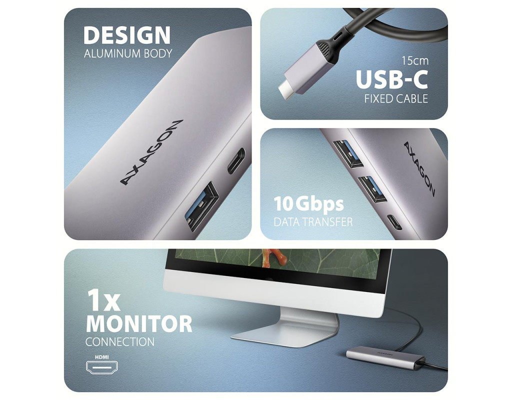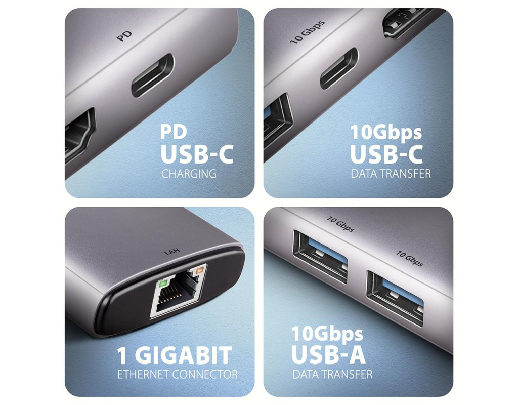 Потужна 6-в-1 док-станція для сучасних ноутбуків AXAGON HMC-6G2L — це універсальний концентратор USB-C 3.2 Gen 2 (10 Гбіт/с), який поєднує шість інтерфейсів у компактному корпусі. Пристрій розширює можливості ноутбуків, ПК та мобільних пристроїв, забезпечуючи одночасне підключення монітора, трьох USB-пристроїв, Gigabit Ethernet-мережі та заряджання через Power Delivery. Це ідеальне рішення для користувачів, які шукають продуктивну й стабільну док-станцію для роботи або мультимедійних задач.