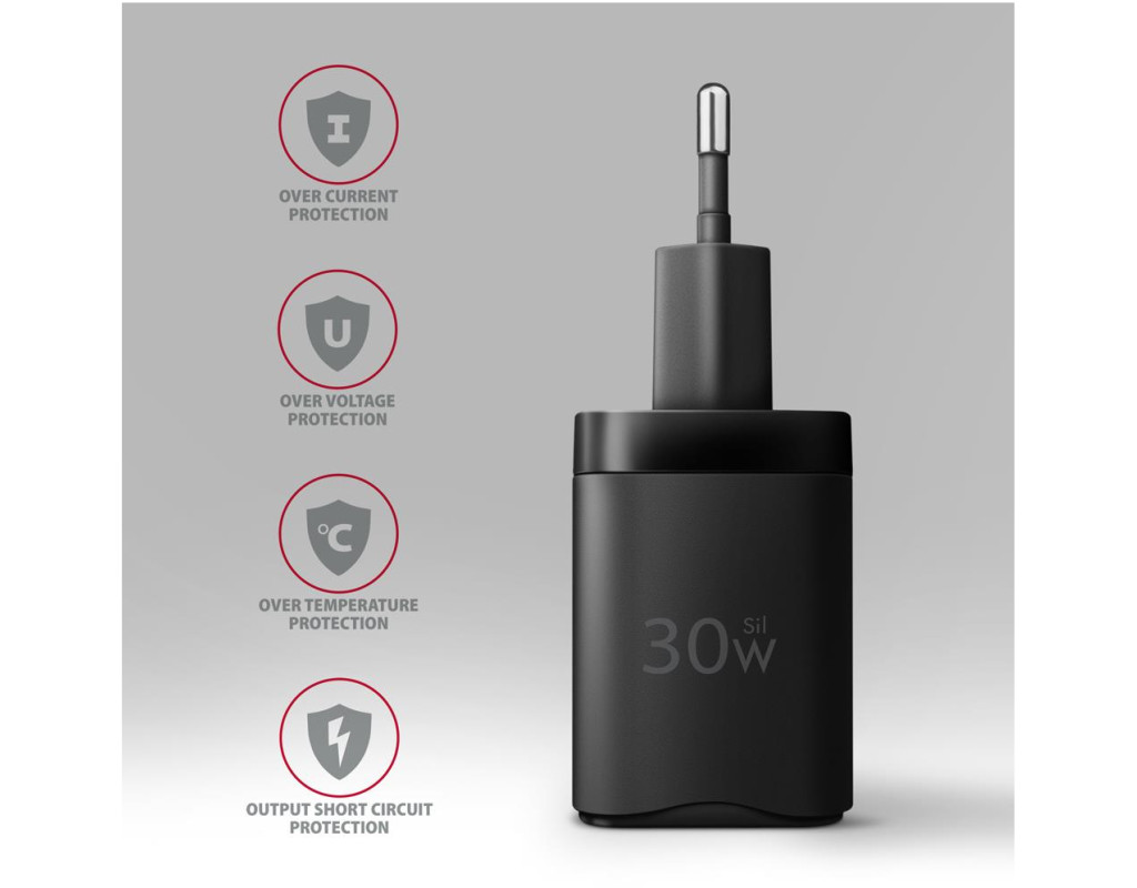 Енергоефективність і компактність Попри потужність 30 Вт, зарядний пристрій має невеликі габарити — 103 × 36 × 32 мм — і масу лише 60 г. Він легко поміщається в кишеню чи сумку, не займаючи зайвого місця. Корпус виконаний із термостійкого пластику з матовою поверхнею, стійкою до подряпин і відбитків пальців. ACU-PQ30 також підтримує вхідну напругу 100–240 В AC, що робить його придатним для міжнародних подорожей.