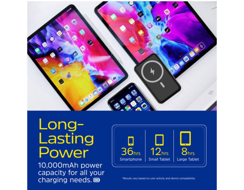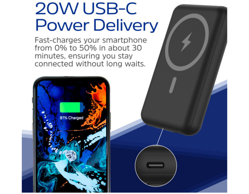 Универсальная мобильная батарея Energizer Magnetic Wireless QM10002PQ 10000 mAh 22,5W быстро и безопасно пополнит заряд USB-устройств и устройств, совместимых со стандартом Qi. Заряжайте до трех устройств одновременно с общей выходной мощностью до 22,5 Вт. Магнитная зарядная пластина батареи надежно зафиксирует ваше Qi устройство с поддержкой технологии MagSafe и обеспечит зарядную мощность до 15 Вт. УМБ также оснащена портами USB Type-C и USB Type-А с максимальной мощностью до 18 Вт каждый. Технология защиты PowerSafe Management защищает УМБ и подключенные устройства от перегрузки, короткого замыкания, перезаряда и переразряда. Компактный корпус и небольшой вес батареи Energizer Magnetic Wireless QM10002PQ 10000 mAh 22,5W делают ее удобной для хранения и переноски. Светодиодная индикация будет предоставлять информацию о текущем уровне заряда батареи, а выдвижная подставка позволяет комфортно работать, заряжая при этом смартфон. |