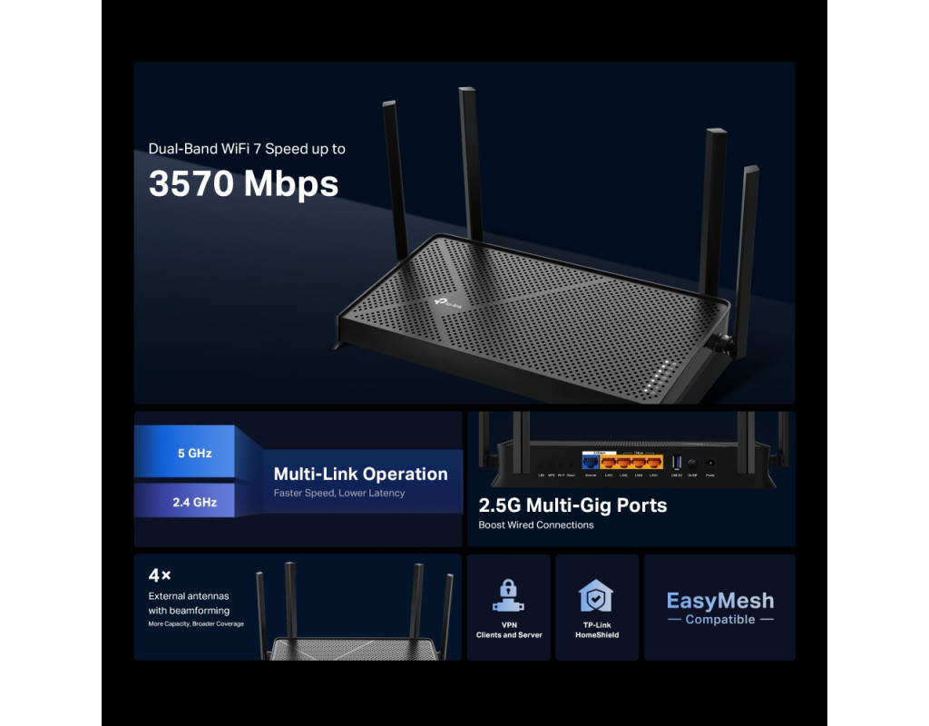 | Двухдиапазонный WiFi 7 со скоростью 3,6 Гбит/с: Двухдиапазонный WiFi BE3600 обеспечивает скорость WiFi до 3,6 Гбит/с.