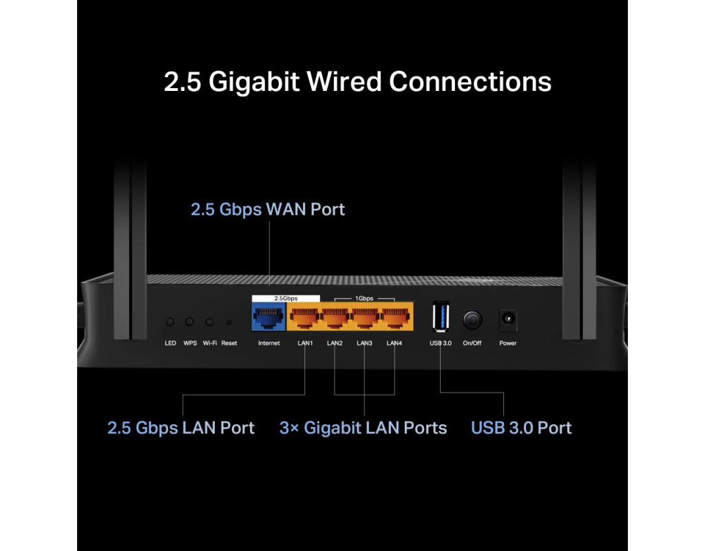 2x 2,5 Гбит/с порты: 1x 2,5 Гбит/с WAN-порт, 1x 2,5 Гбит/с LAN-порт и 3x 1 Гбит/с LAN-порты обеспечивают высокоскоростную передачу данных. Максимальное покрытие: 4 внешних антенна вместе с технологией Beamforming обеспечивают большую пропускную способность, более прочные и надежные соединения и меньше помех. Совместимость с EasyMesh: работает с маршрутизаторами EasyMesh и удлинителями диапазона, образуя непрерывную сеть Mesh WiFi во всем доме, предотвращая перепады и задержки при переходе между сигналами. Простая настройка и использование: управление сетью никогда не было таким простым благодаря приложению Tether. TP-Link HomeShield: повышенная безопасность защищает от новейших киберугроз. Отличная совместимость: поддерживает все поколения Wi-Fi, устройств и всех интернет-провайдеров. |