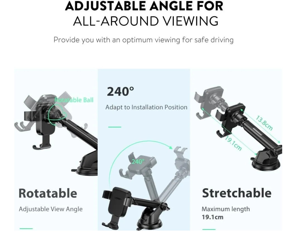 Держатель телефона в автомобиль UGREEN LP200 – это универсальное и удобное решение для использования вашего смартфона во время поездок. Он предназначен для крепления телефона на присоску, которая надежно прикрепляется к стеклу или гладкой поверхности в автомобиле. Особенности: - Присоска надежно прилипает к приборной панели или лобовому стеклу.