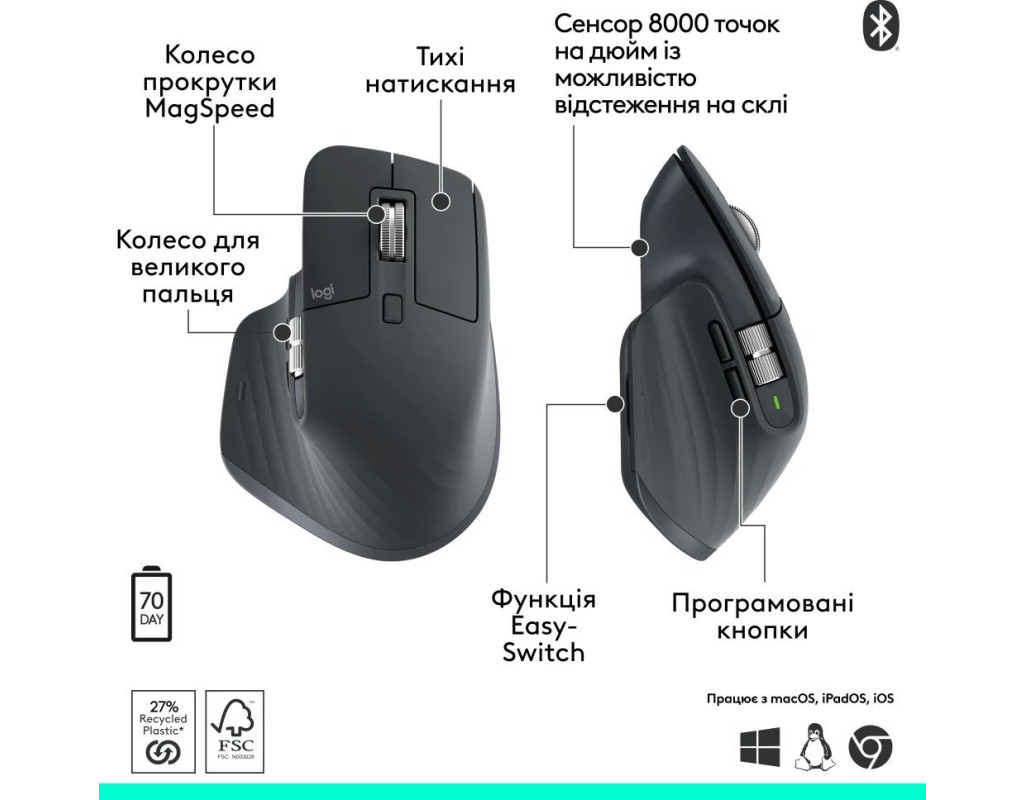 Мы создали DEX при участии лучших игроков со всего мира. Результат: следующая эволюция чемпионской мыши, созданная специально для работы правой рукой с полным контролем. Тихие нажатия Bluetooth-мышь MX Master 3S с тихим нажатием имеет приятный тактильный отклик, но уровень шума при нажатии на 90 % ниже. Теперь с отслеживанием 8000 точек на дюйм Работайте на любой поверхности – даже на стекле – с помощью сенсора с чувствительностью 8000 точек на дюйм, который можно настраивать. Плавное управление несколькими компьютерами Беспрепятственно работайте на нескольких компьютерах или ноутбуках и передавайте текст, изображения и файлы между Windows и macOS. Быстрая зарядка, длительный срок службы Через USB-C заряжается за 1 минуту для 3 часов использования, а полного заряда хватает на 70 дней. Безграничные возможности настройки Настройте кнопки и оптимизируйте рабочий процесс с помощью профилей для конкретных программ в приложении Logi Options+. |