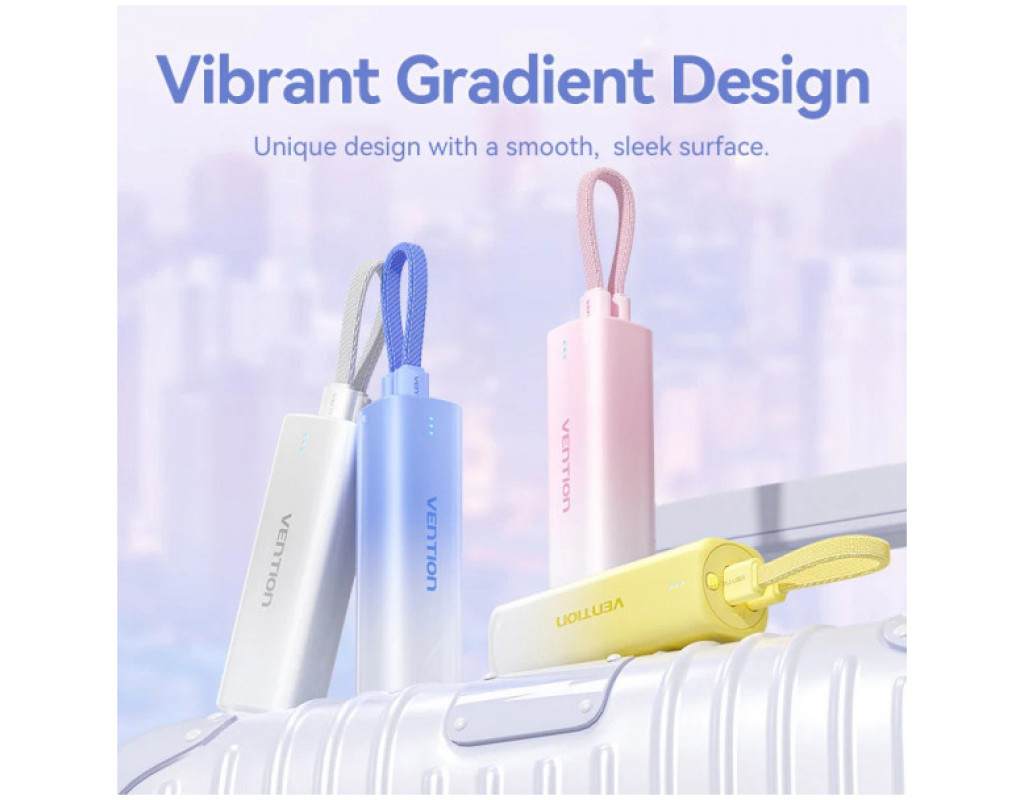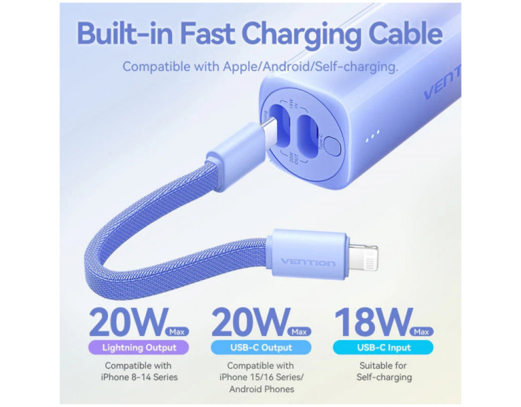 Компактна універсальна мобільна батарея ємністю 5000 мАг Vention 5000mAh 20W PD допоможе швидко та безпечно зарядити USB пристрої. Вона підтримує протокол швидкого заряджання PD 20 Вт. УМБ оснащена двома портами – Lightning і USB Type-С та двостороннім кабелем Lightning-USB Type-С. Порти Lightning та USB Type-С працюють з максимальною вихідною потужністю 20 Вт, та з потужністю до 18 Вт на вхід. Світлодіодна індикація сповіщатиме про поточний рівень заряду Мініатюрний корпус УМБ Vention 5000mAh 20W PD розміром 99,8х30х30 мм та вагою 160 грам робить її зручною для зберігання та перенесення. |